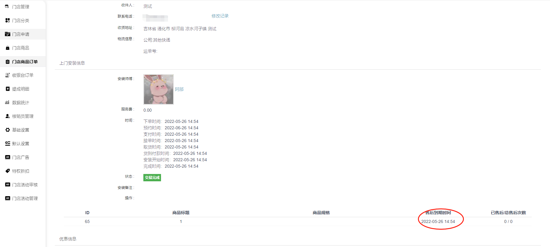 5、点击订单查看详情可查看到上门安装信息,订单商品的售后到期时间(安装完成才显示),售后次数