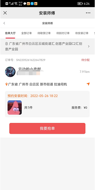 4、 安装师傅在此列表可点击我要抢单进行抢单