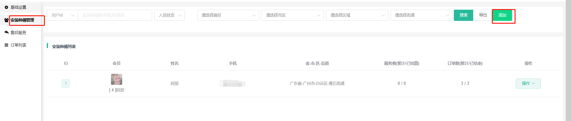 2) 添加后可在此列表查看到安装师傅的地址,服务费订单数量