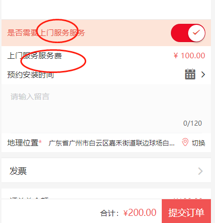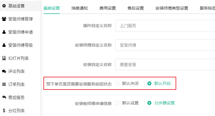 默认关闭则提交单页面默认关闭是否上门安装服务/默认开启则提交页面默认开启需要上门安装服务