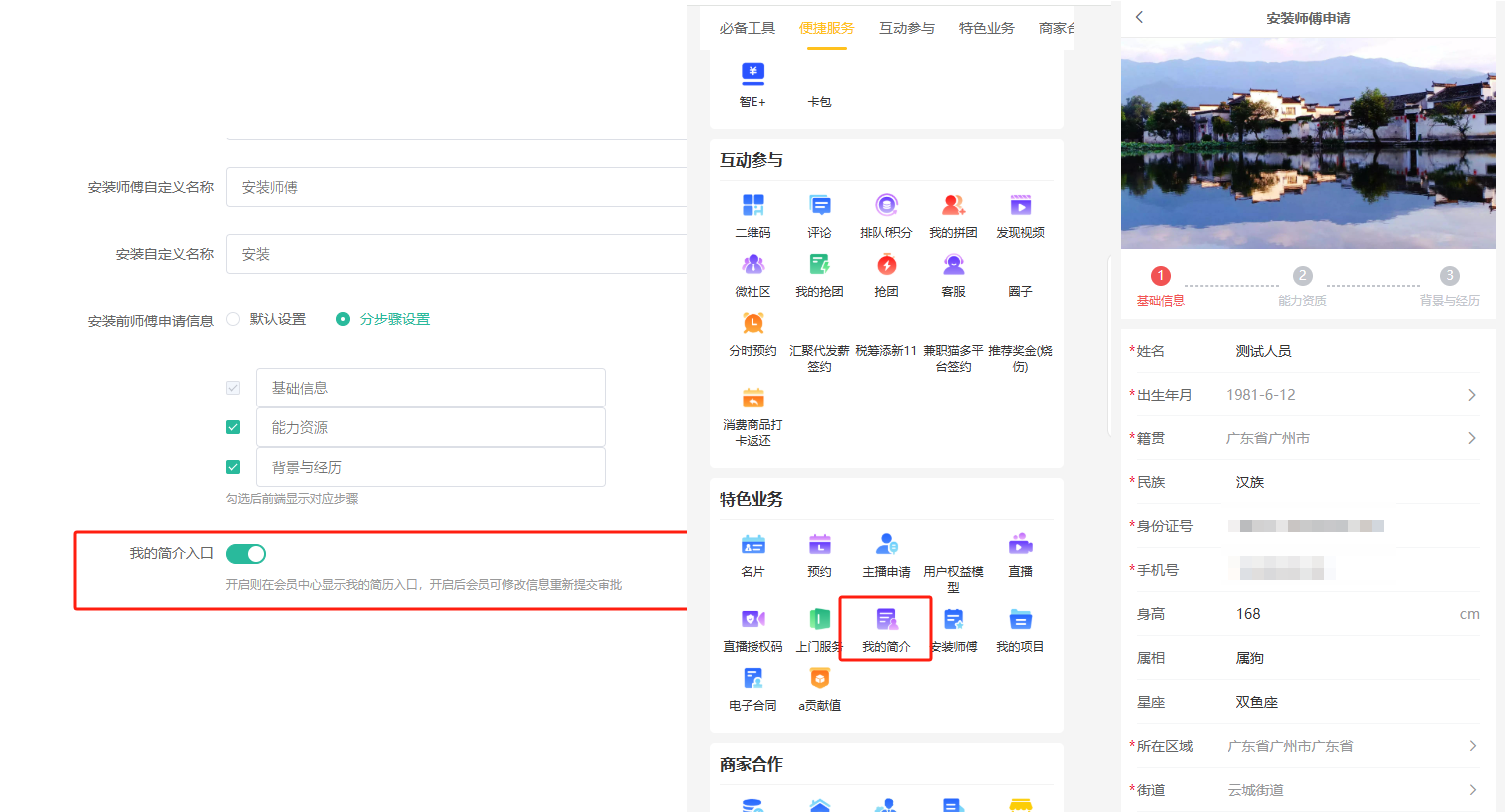5)我的简介入口:开启则在会员中心显示我的简历入口,开启后会员可修改信息重新提交审批