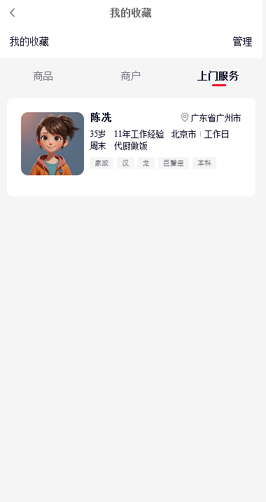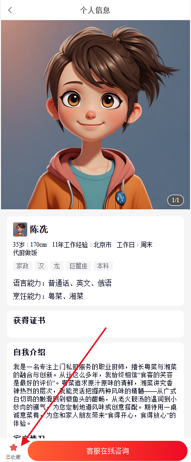 点击师傅页面下方的收藏,收藏后是在会员中心–收藏中进行查看~