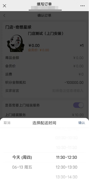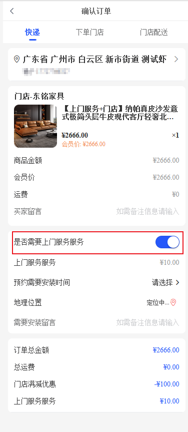 注意:只有门店商品才有上门安装的功能,需有快递方式。