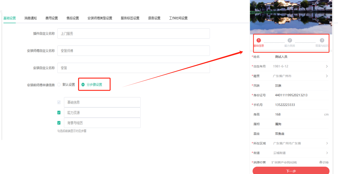 4)安装师傅申请协议:新增分步骤设置,选择后 前端申请师傅时 需按步骤填写信息