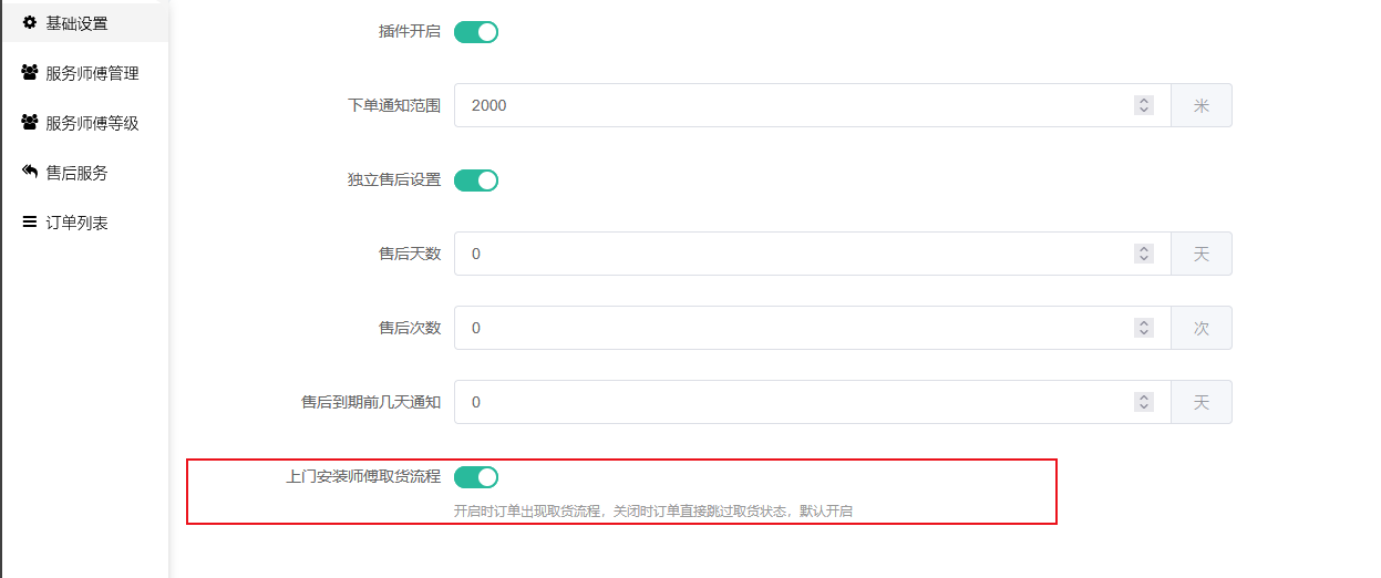 5)上门安装师傅取货流程:开启时订单出现取货流程,关闭时订单直接跳过取货状态,默认开启