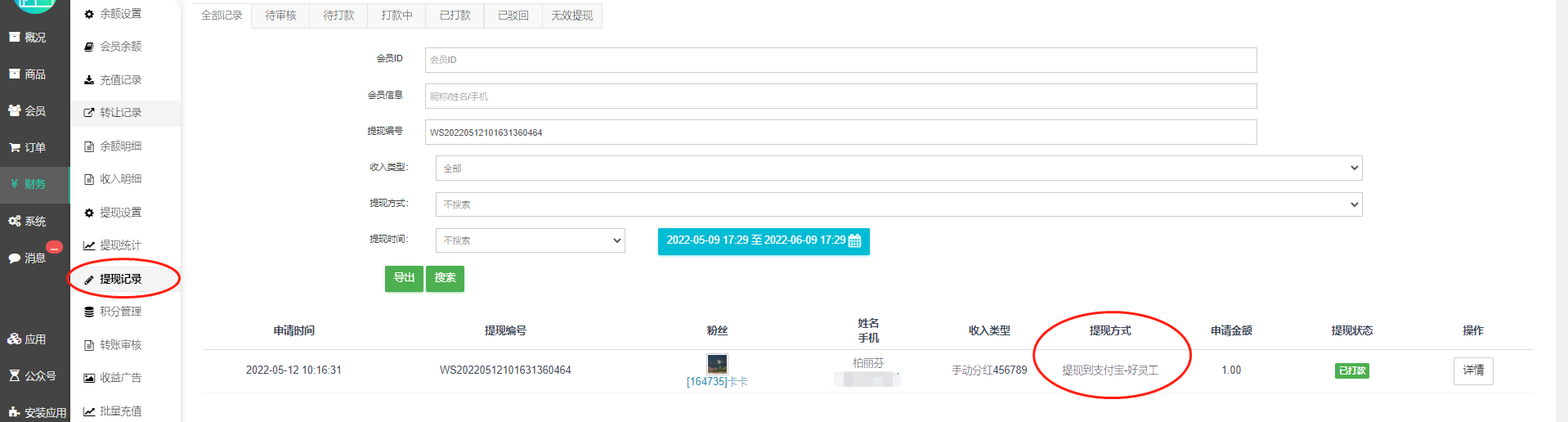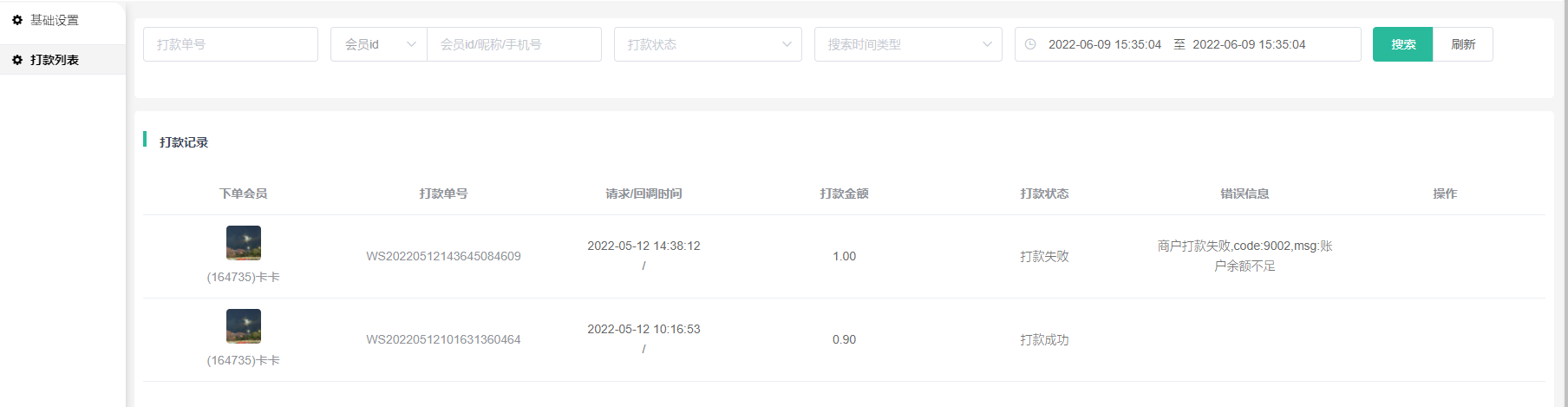 查看会员信息,打款单号,请求/回调时间,打款金额,打款状态等内容信息