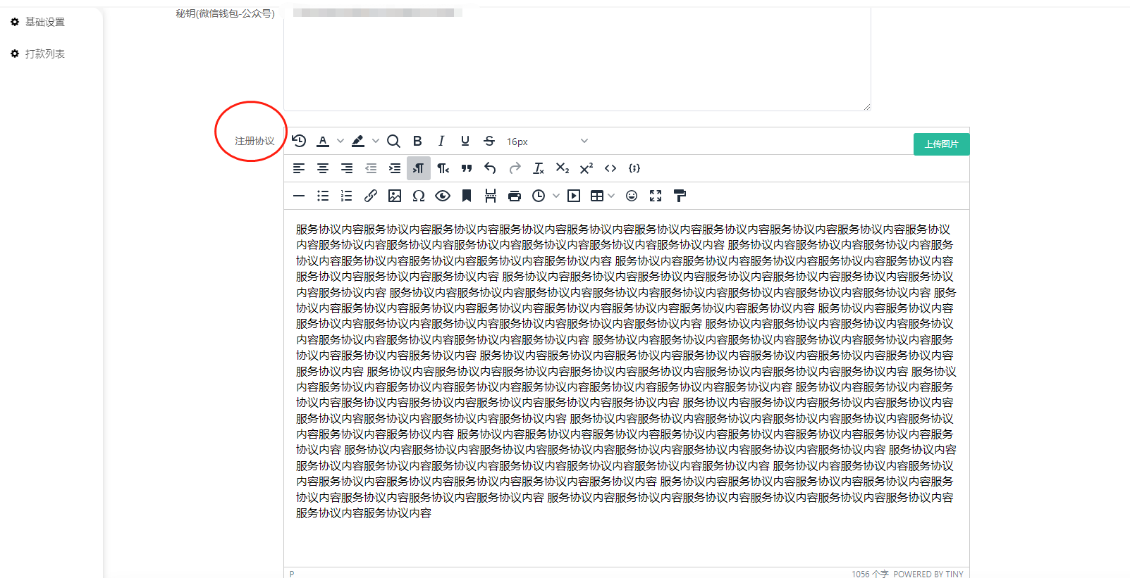 后台填写协议内容,会员在注册好灵工页面 –点击服务协议 进行查看