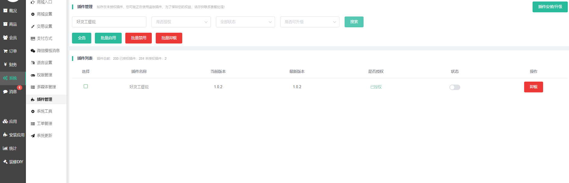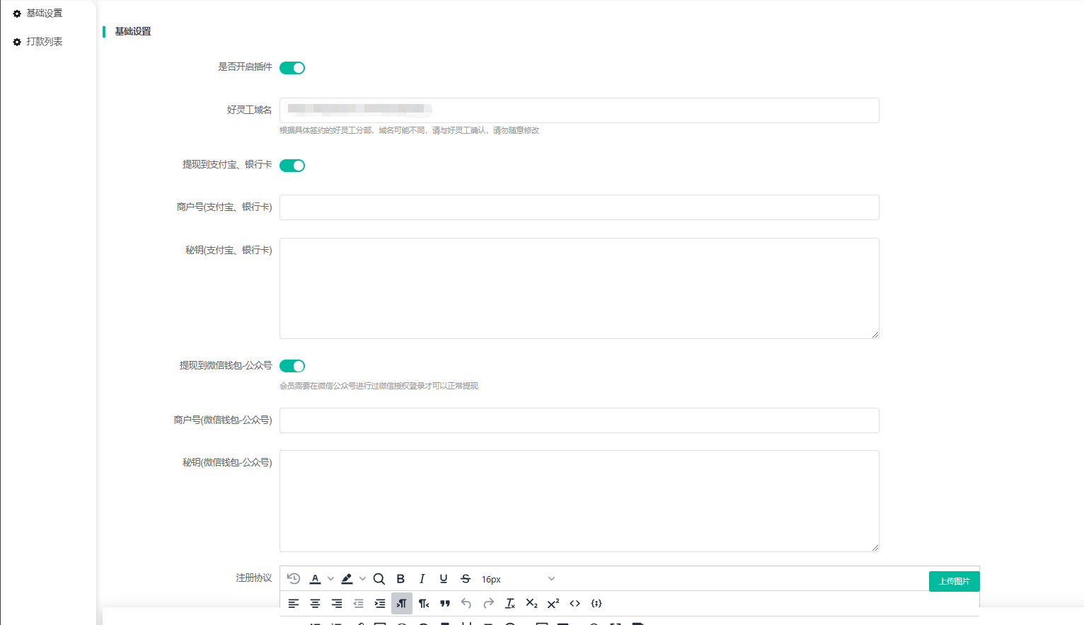 需要先进行配置提现到支付宝、银行卡或提现到微信钱包-公众号,才能开启插件使用!