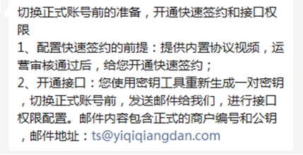 2、开通接口:您使用密钥工具重新生成一对密钥,切换正式账号前,发送邮件给我们,进行接口权限配置。邮件内容包含正式的商户编号和公钥,邮件:ts@yiqiqiangdan.com