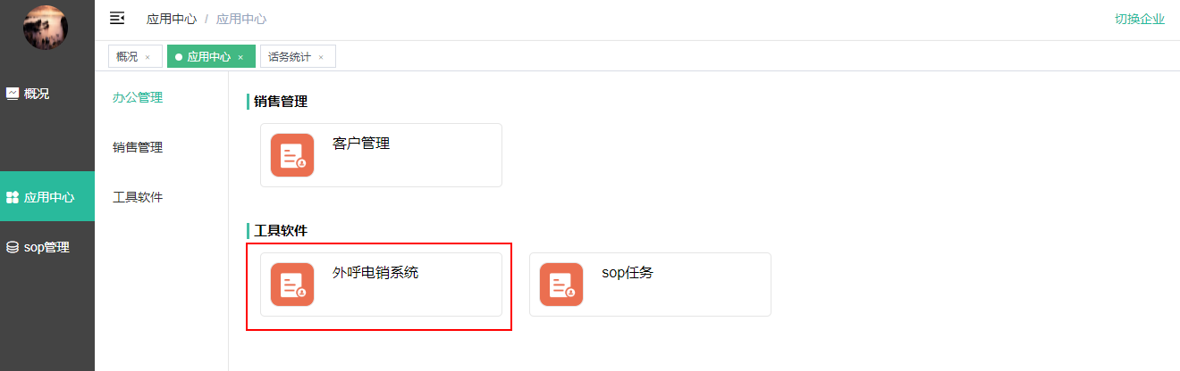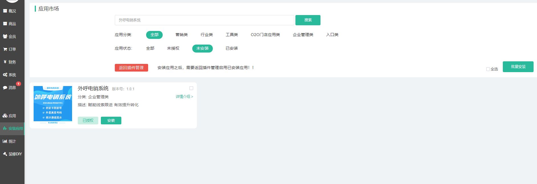 安装路径:总后台 — 安装应用 — 搜索“外呼电销系统”并安装