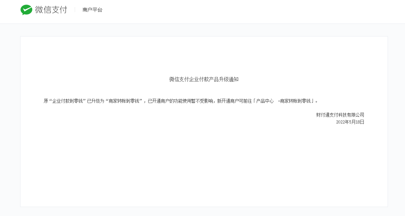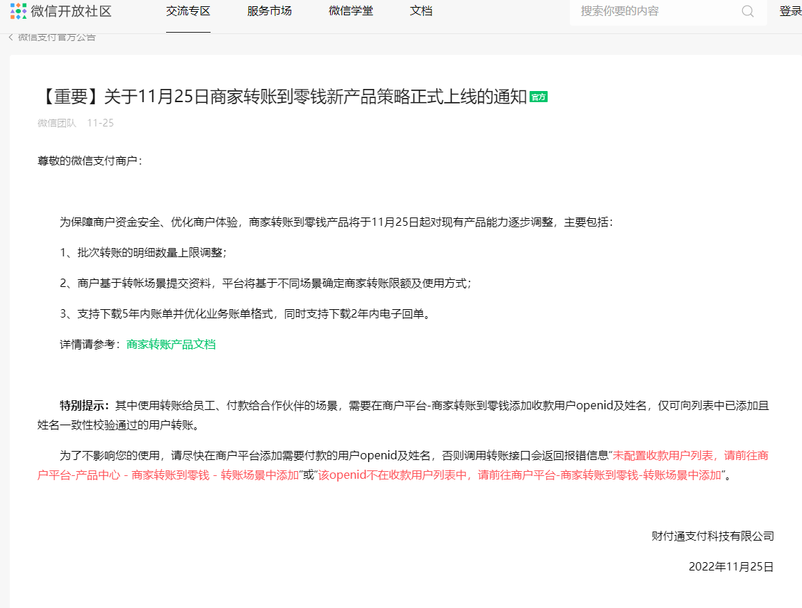 2022年11月25日,商家转账到零钱新产品策略正式上线,详情可参考:商家转账产品文档 、商家转账到零钱规则改版解读