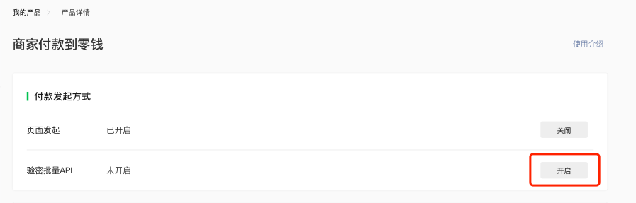 商户进入微信支付【商户平台pay.weixin.qq.com -> 产品中心 -> (运营工具模块)商家转账到零钱】,点击开通进入开通流程。