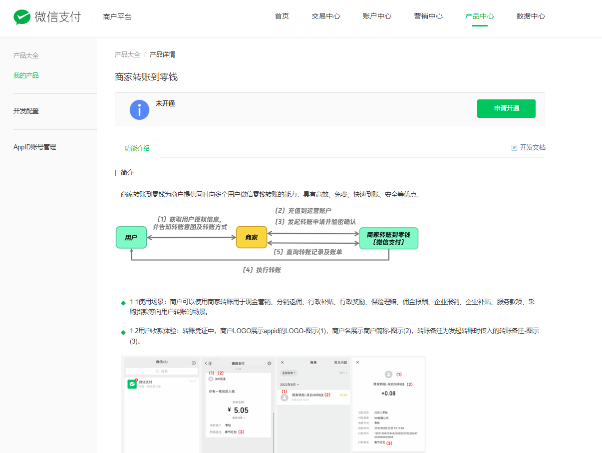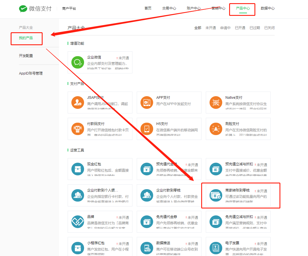 商户号已开通好商家转账到零钱产品权限,可通过「商户平台 -> 产品中心 -> (运营工具)商家转账到零钱 -> 前往功能」完成各项设置、通过页面发起转账和查询转账记录。