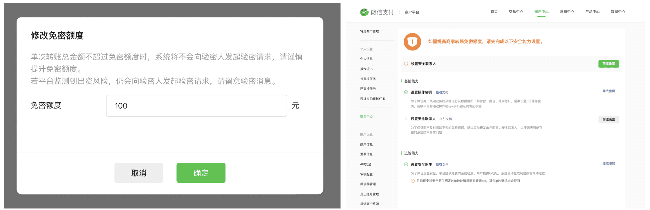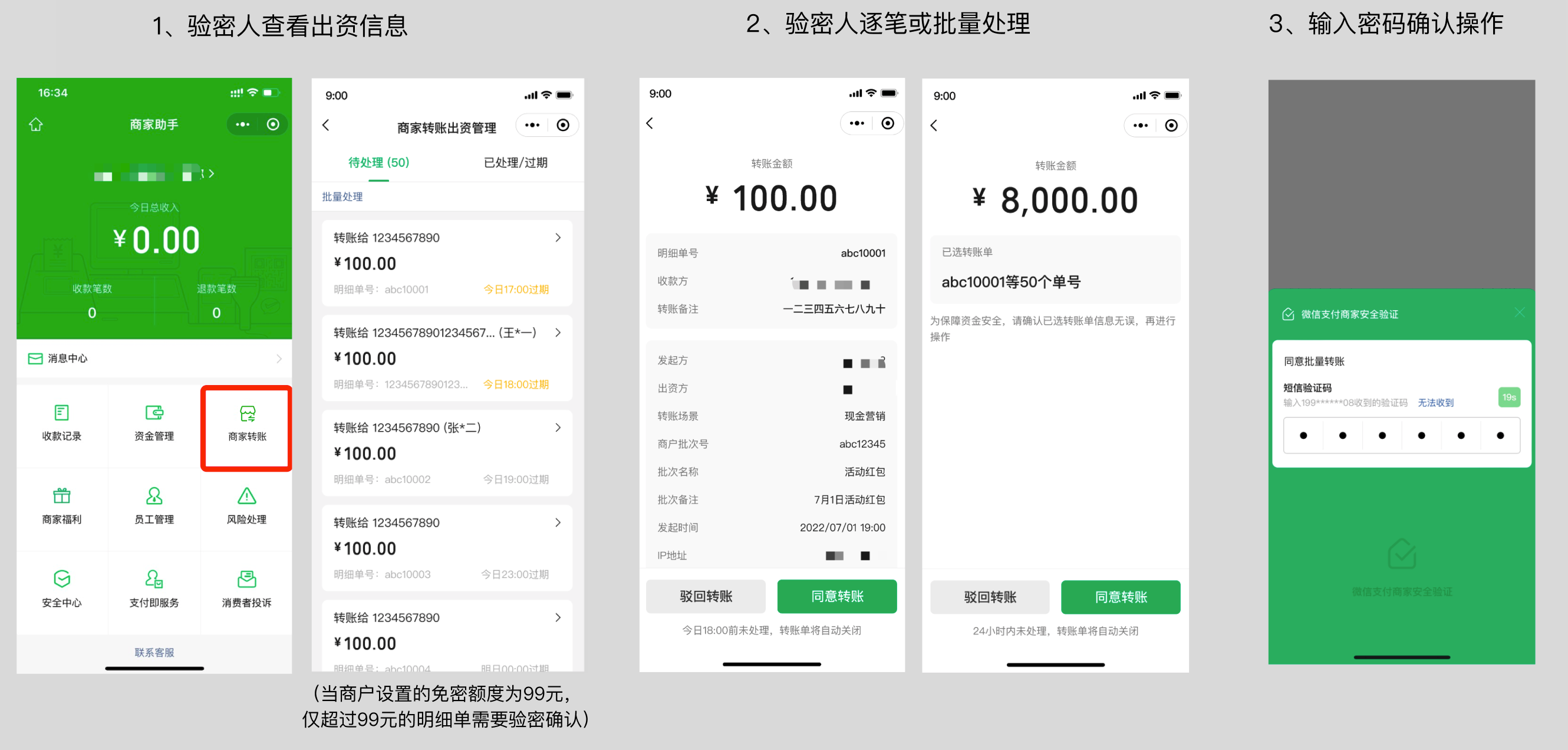 在保障安全的前提下,为提高付款效率,商家可以申请一定的免密额度,在免密额度内的付款将不会给验密人发送验密通知。设置免密付款,可参考:商家付款验密操作指引