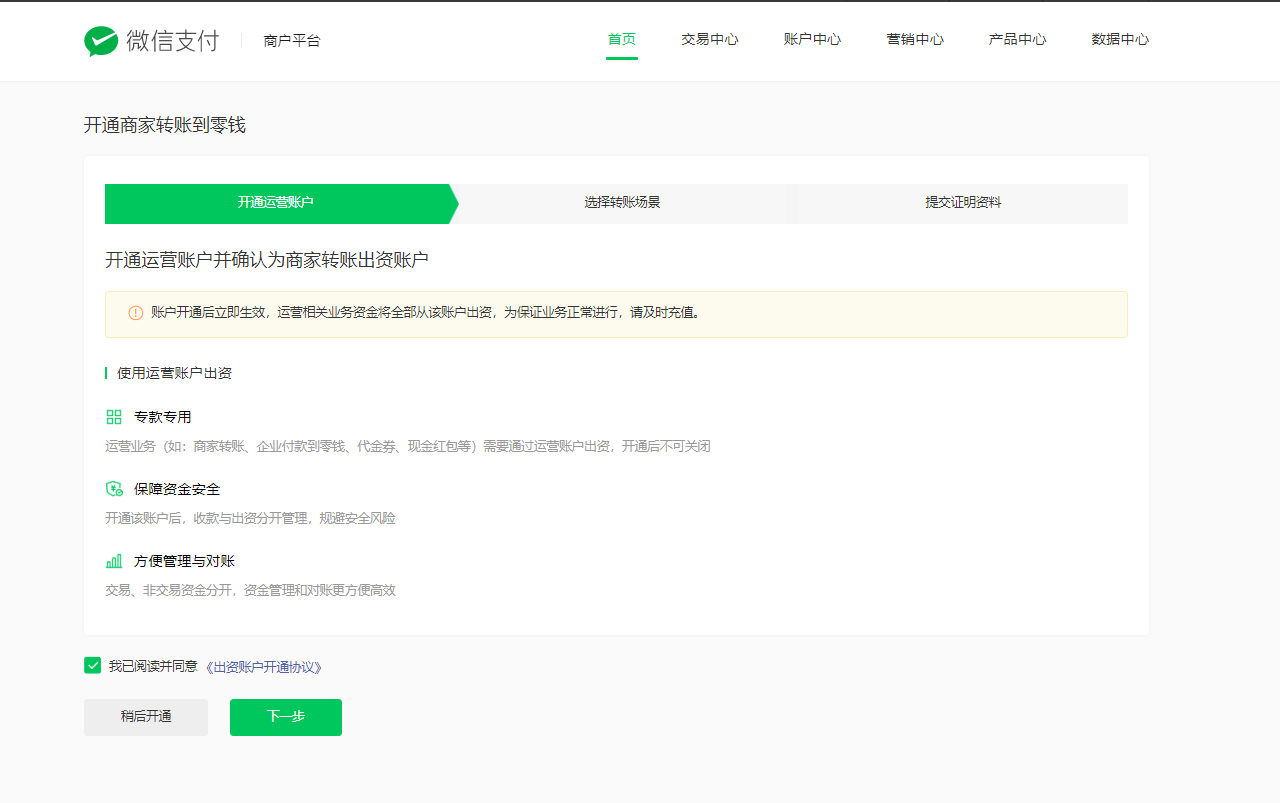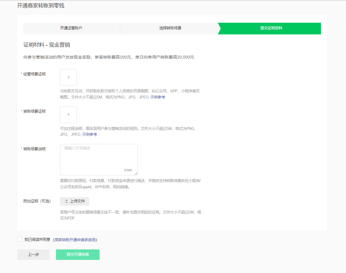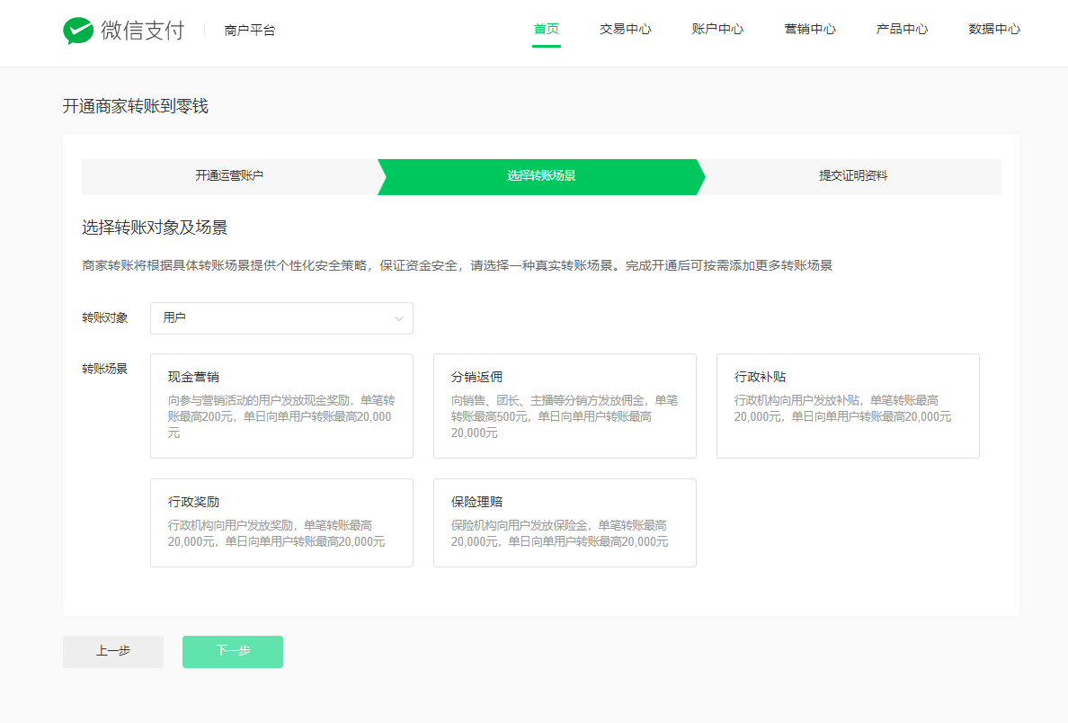 按指引开通运营账户(若商户号已开通运营账户,本步骤确认即可)、选择转账场景、提交证明资料。每个商户最多可在商户平台申请3种转账场景: