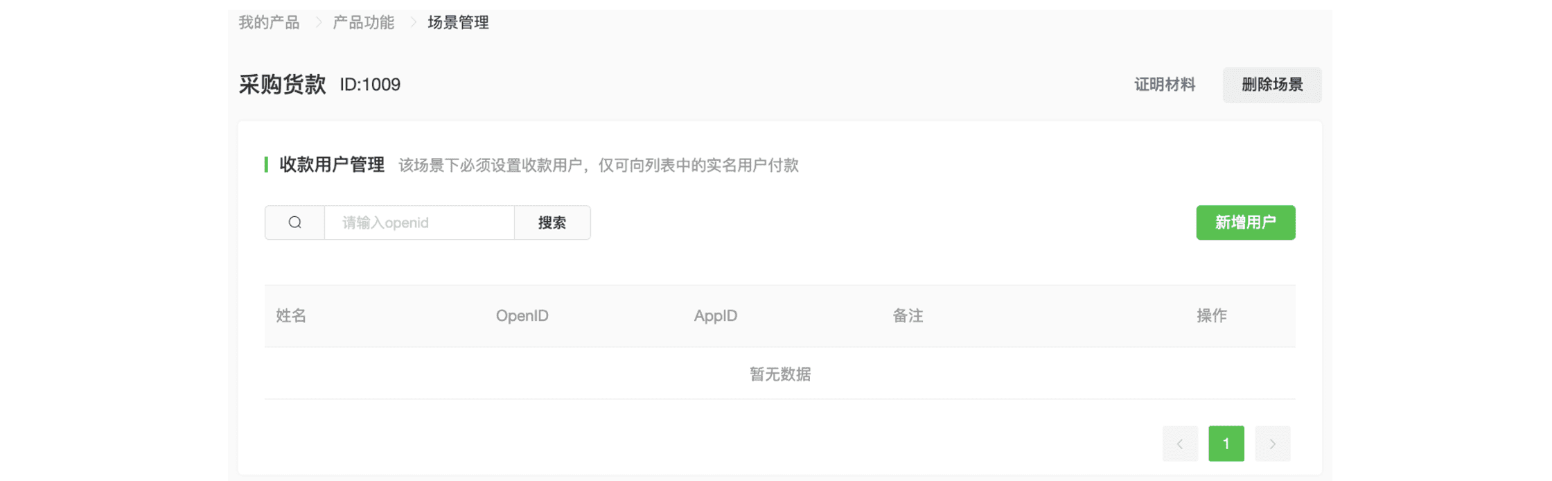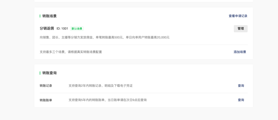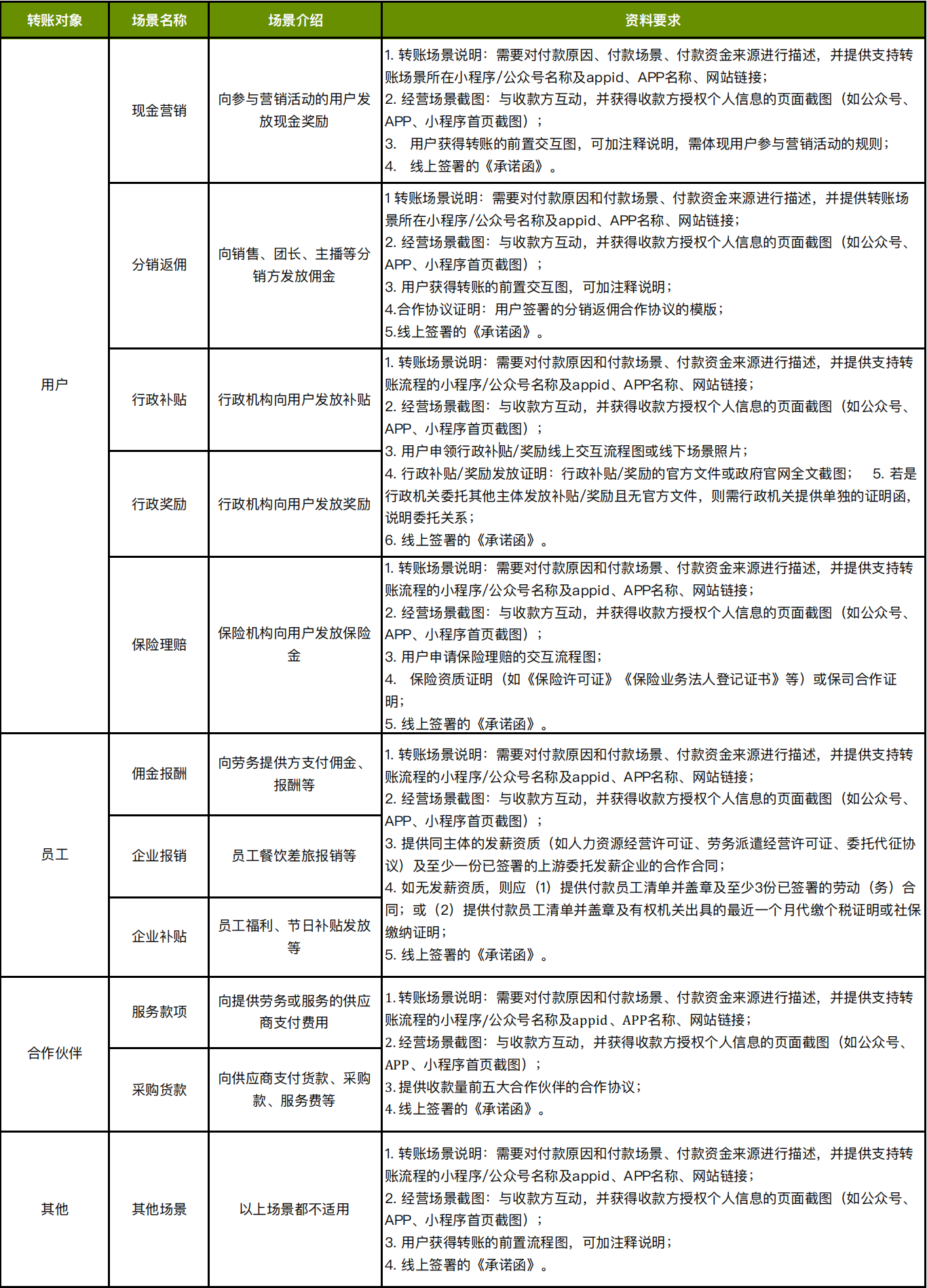 商户平台支持新增、删除、管理转账场景,也可查看申请时提交的场景证明材料。
