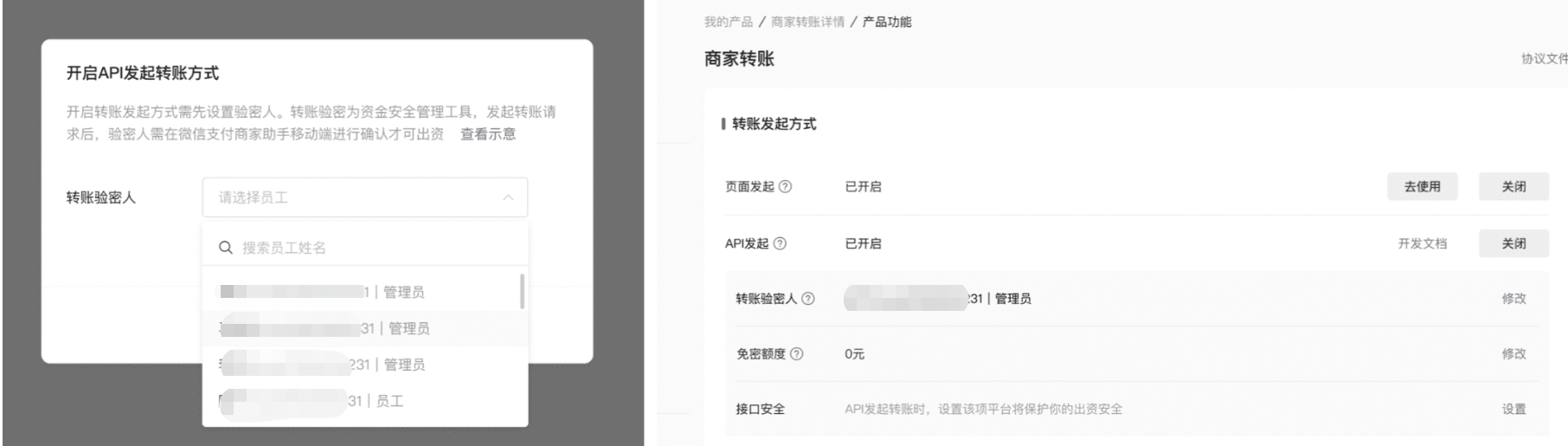 (2)使用API发起转账,需要额外设置转账验密人,并且在开启后设置接口安全(配置API 调用的IP地址)才可发起转账。