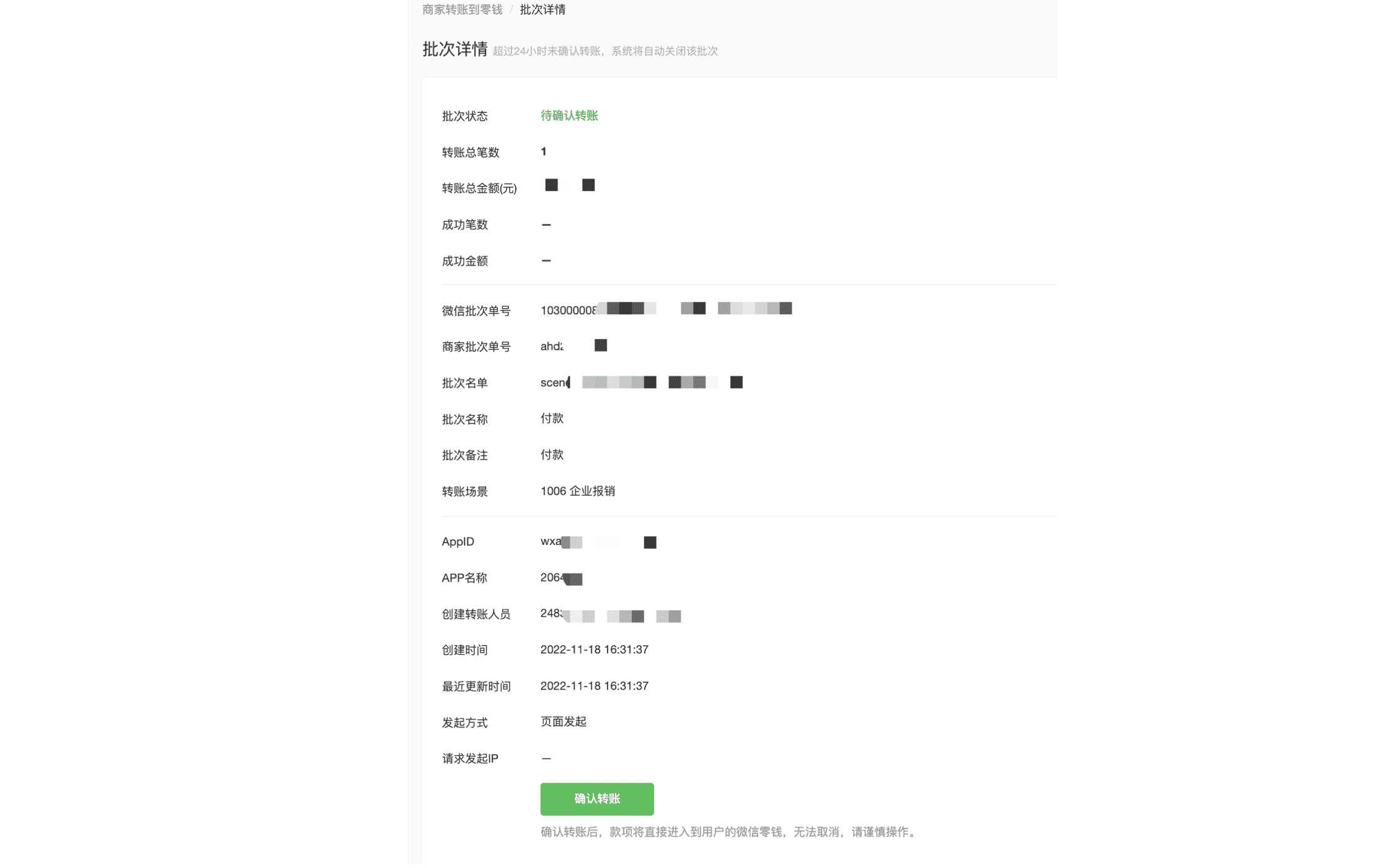 转账规则请至平台下载模版后查看。若超过24小时未确认,系统将关闭转账。确认后资金将转入用户的微信零钱,不可取消。
