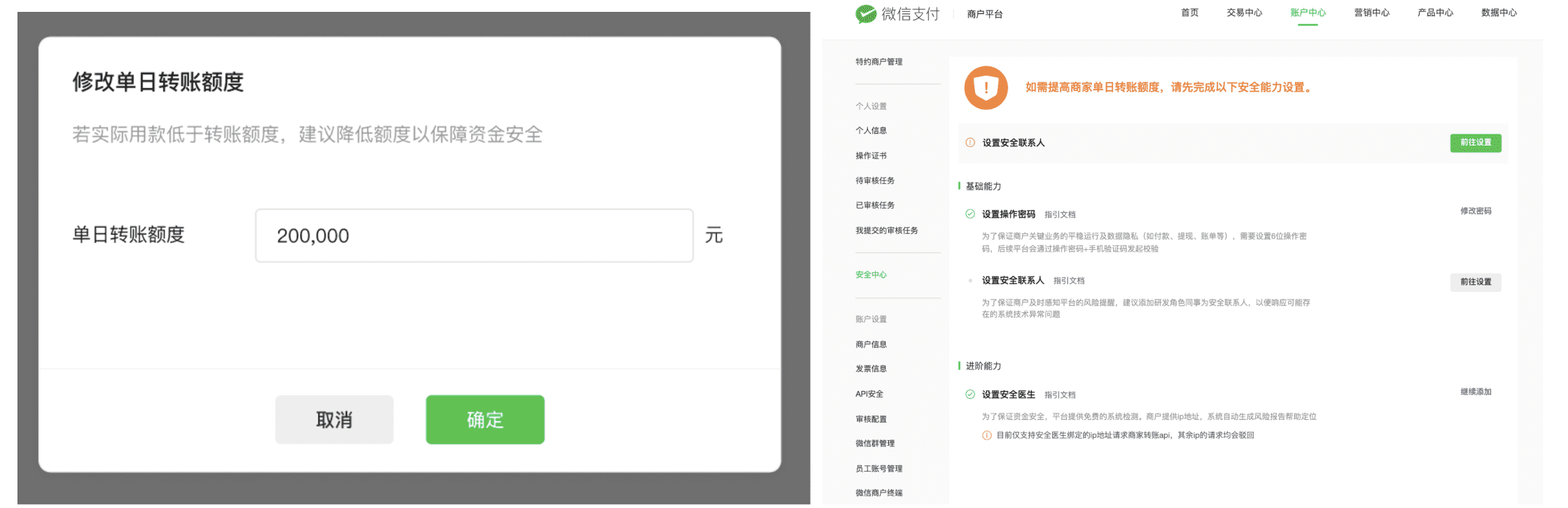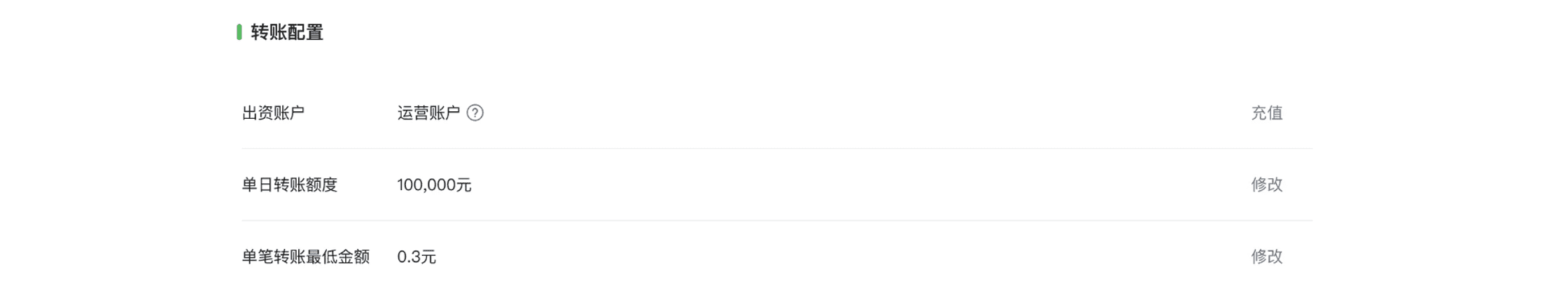 单日转账额度为商户号单日累计可出资的最大额度。为保障资金安全,建议根据业务实际出资情况设置合理值。