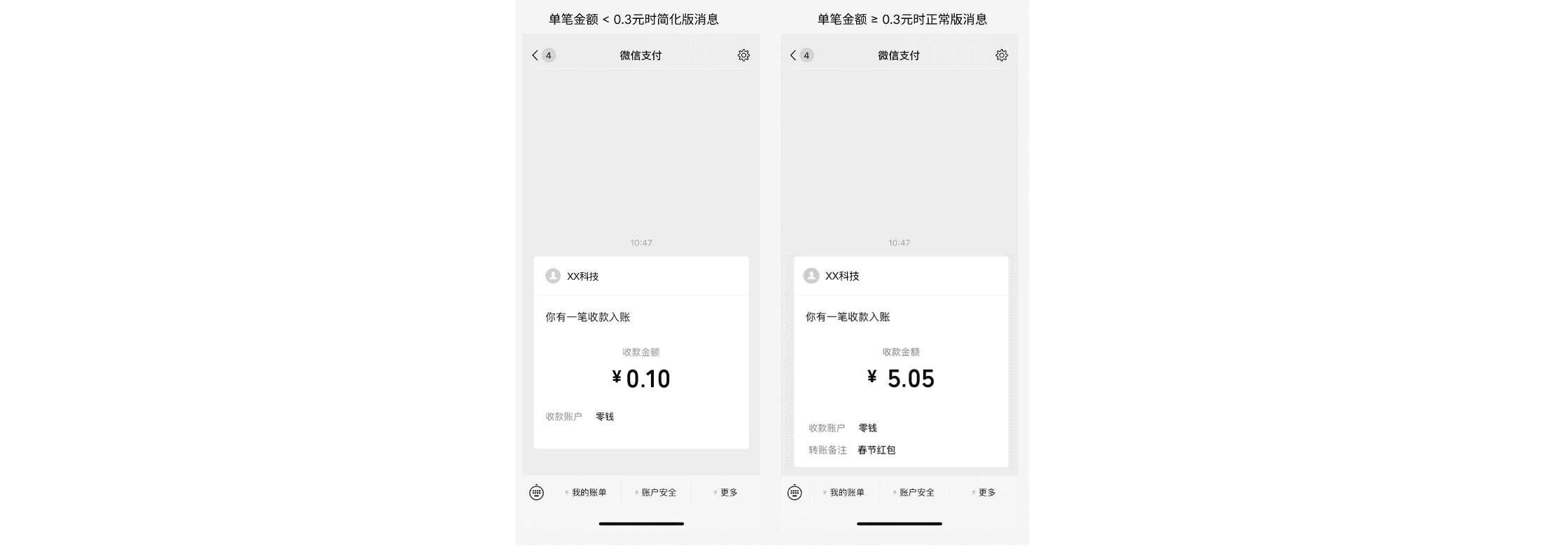 若单笔转账金额低于0.3元时,用户端收款凭证将不展示转账备注信息,区别如下图
