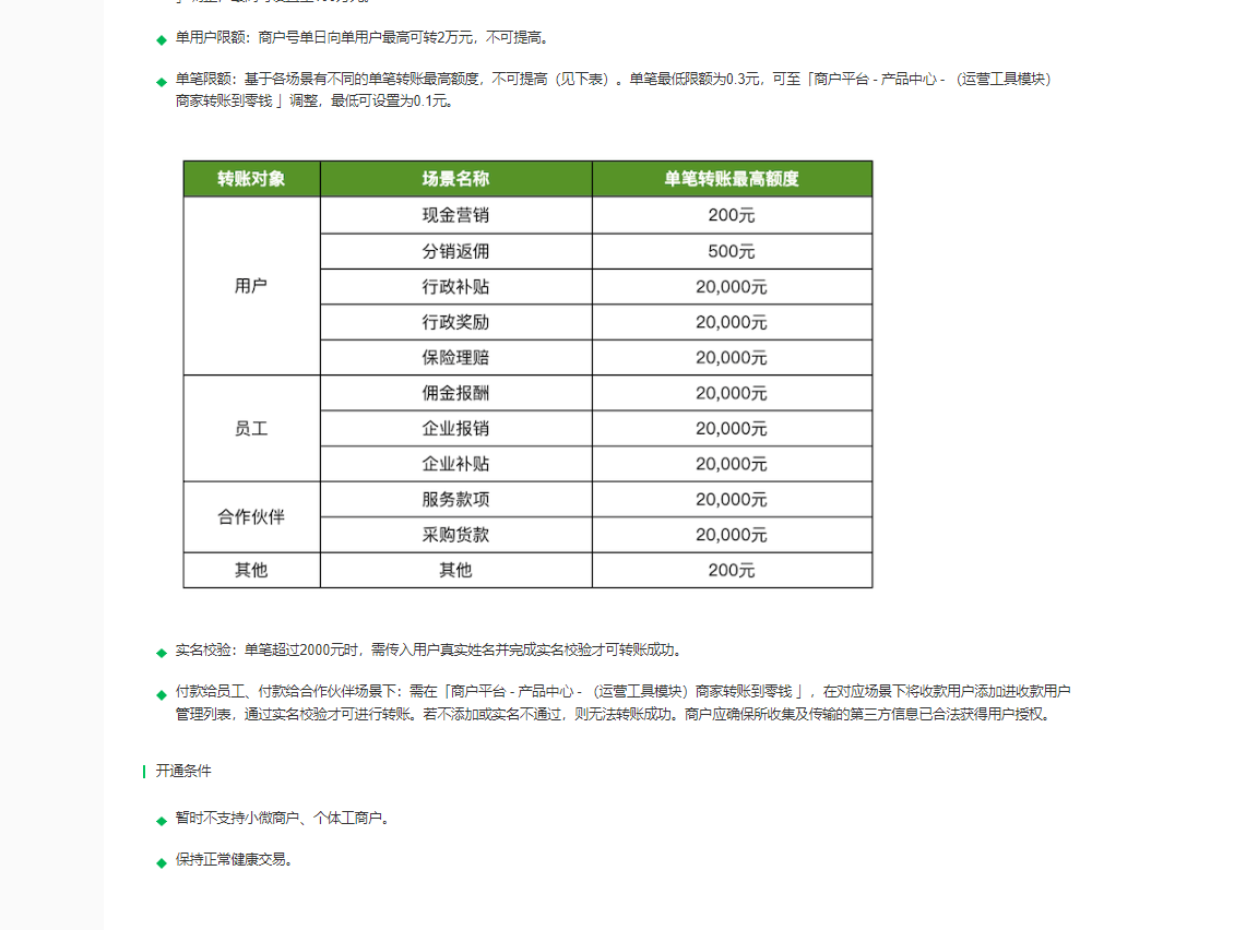 付款给员工、付款给合作伙伴场景下(佣金报销、企业报销、企业补贴、服务款项、采购款项场景) 只支持向已添加为收款用户列表中的用户发起转账,且该用户已完成微信支付实名认证。