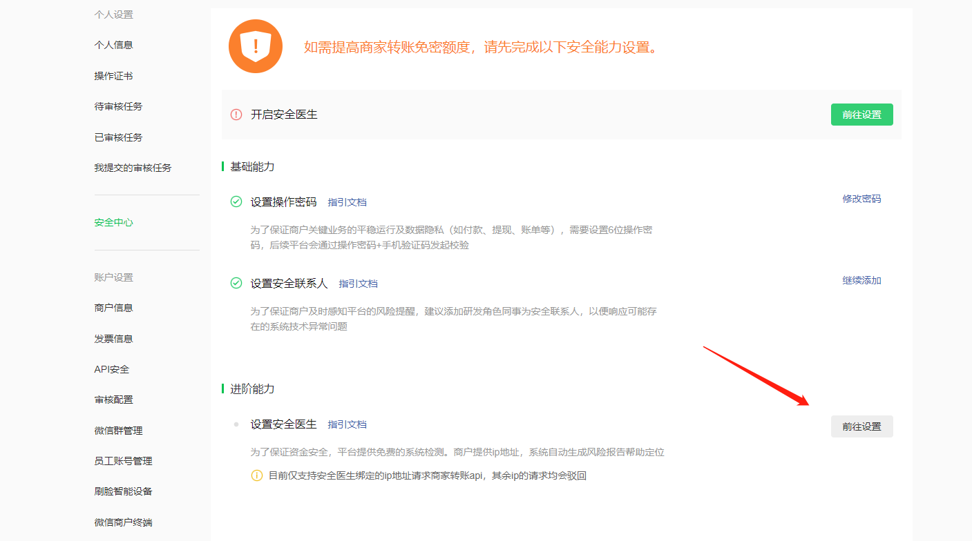 三、开通商家转账到零钱的权限、配置流程(开通权限–配置转账方式–设置ip接口安全–转账额度–设置aplv3密钥–商城后台填写等)