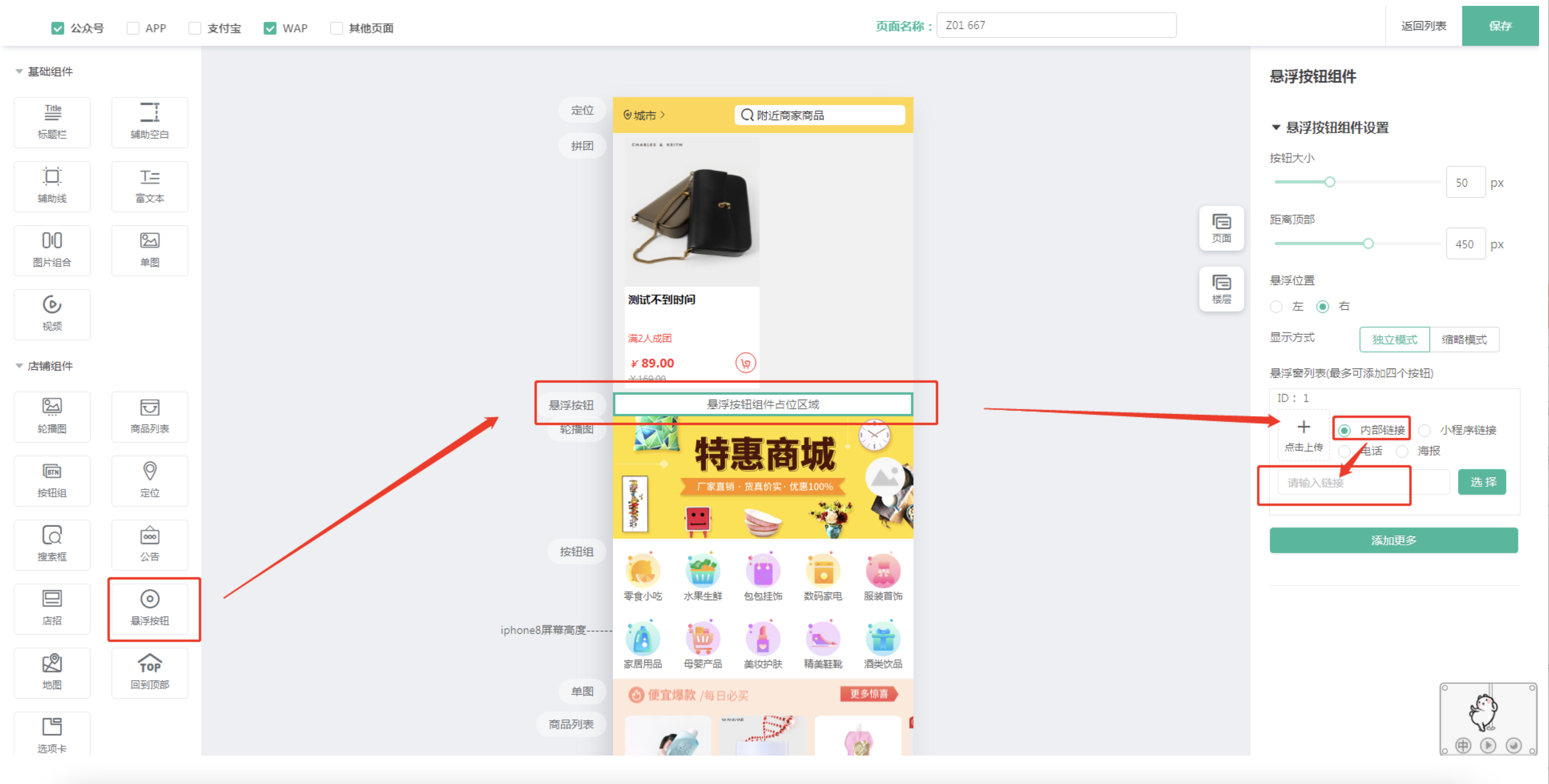 5、如果您使用的是装修DIY,可以将客服链接放到悬浮按钮、DIY页面任何链接都可以,用户点击链接即可发起QQ客服咨询。