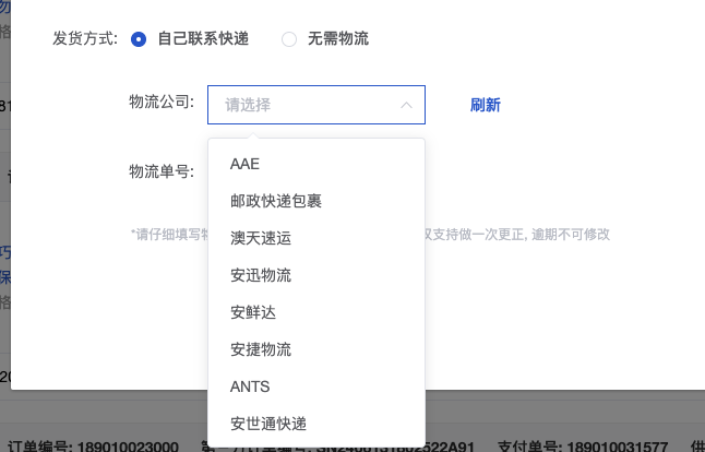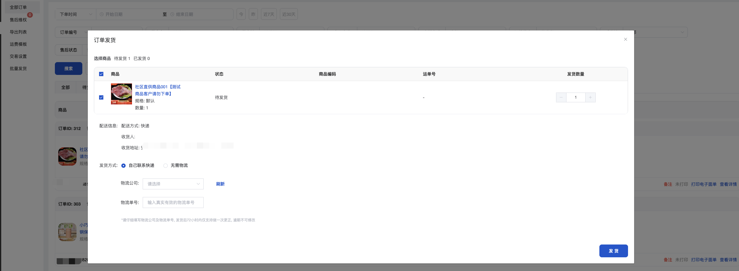 确认发货:支持多包裹发货;选择发货方式(自己联系快递,无需物流);选择物流公司,填写物流单号。
