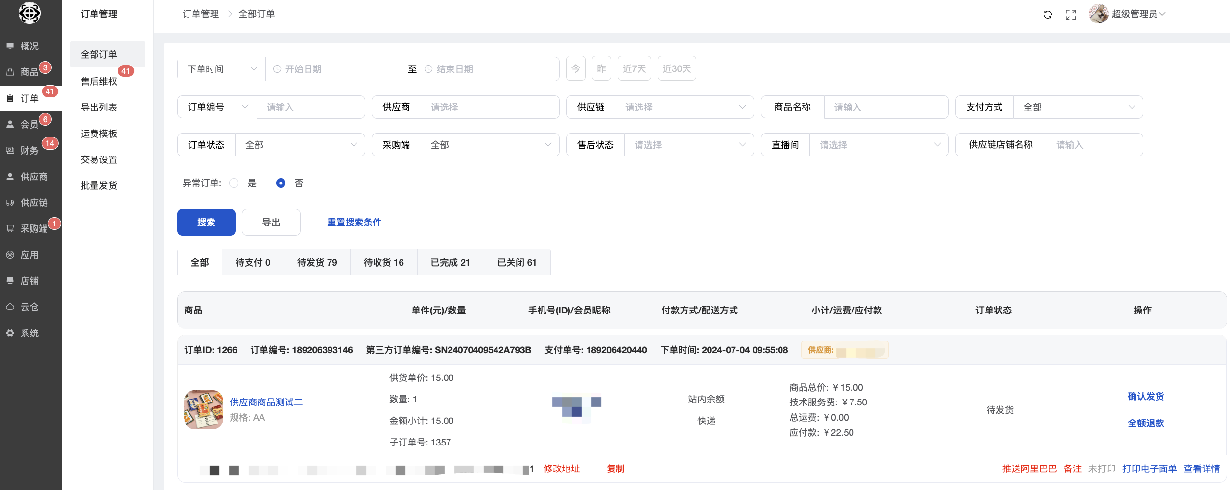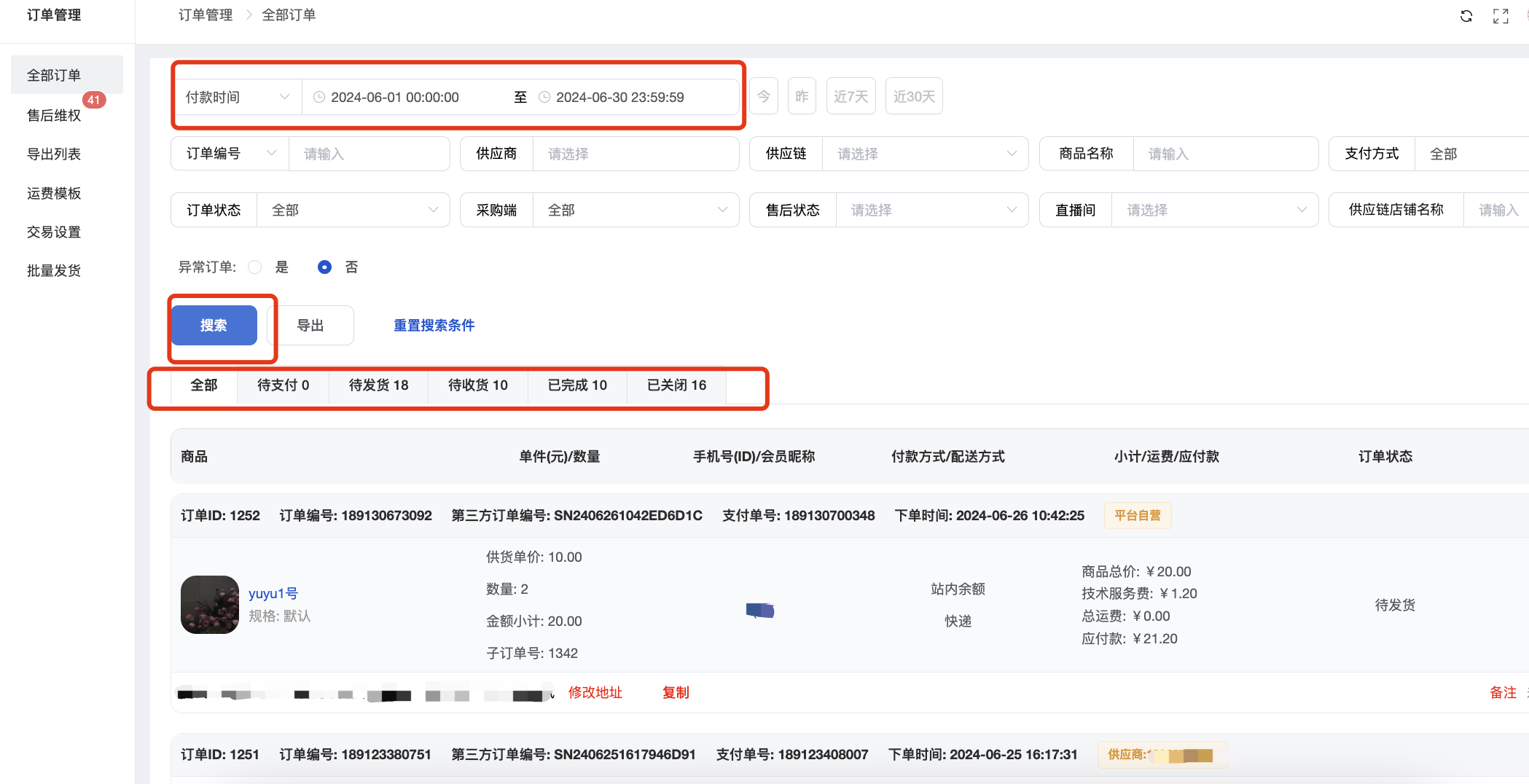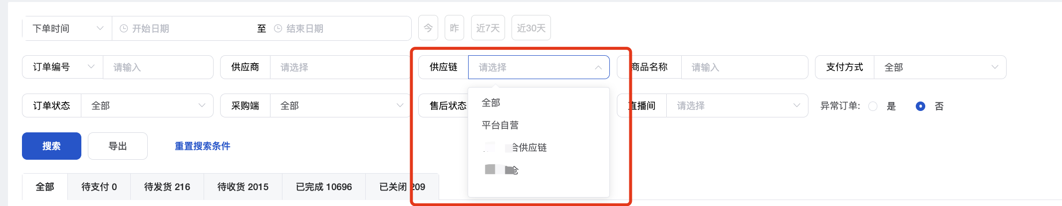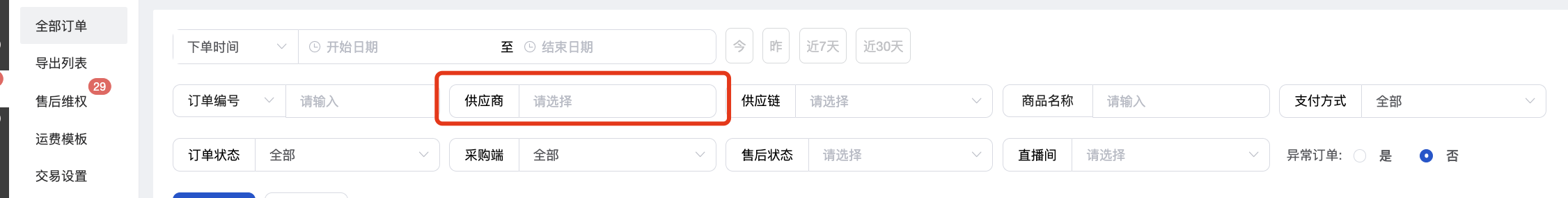 (3)供应商:支持筛选平台自营、全部供应商、指定供应商订单;