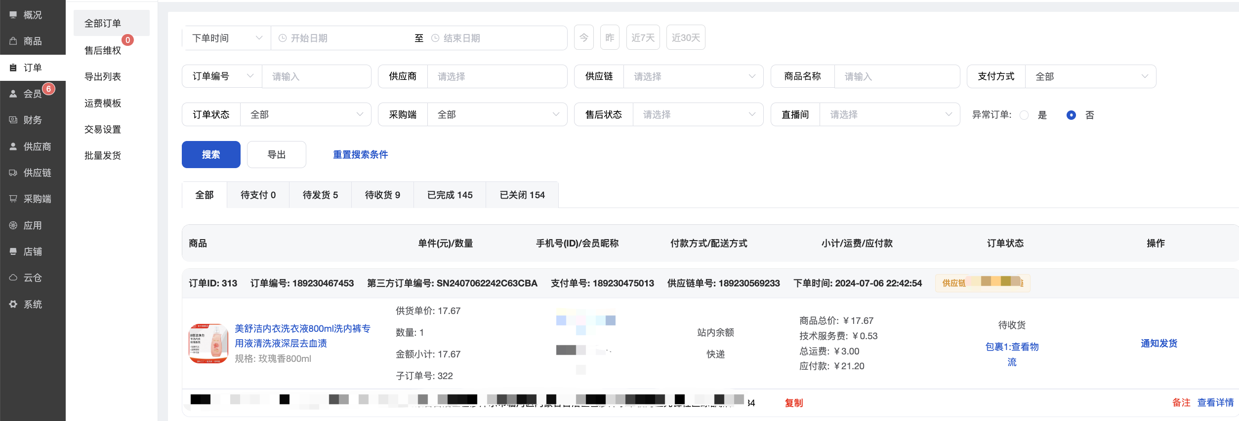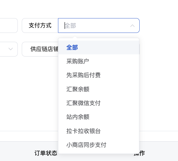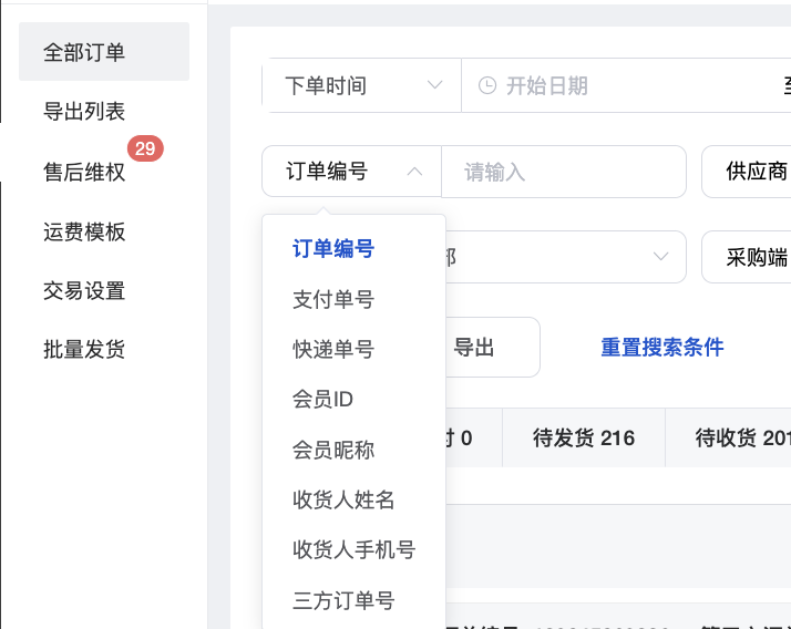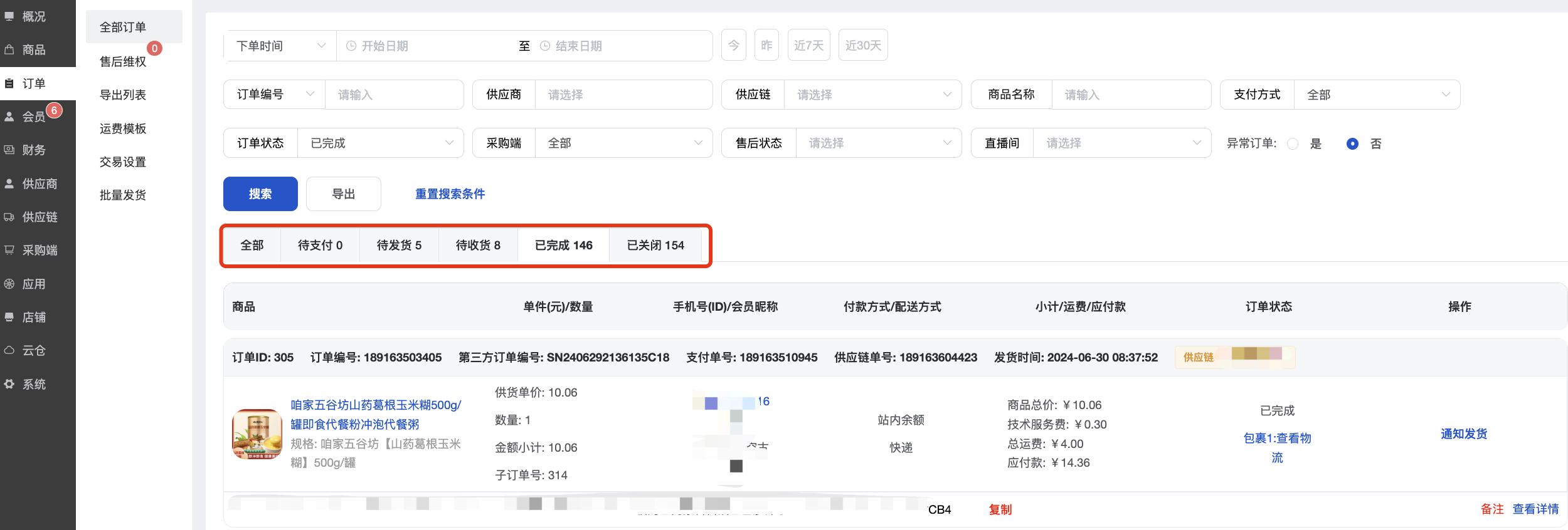 (3)供应商:支持筛选平台自营、全部供应商、指定供应商订单;