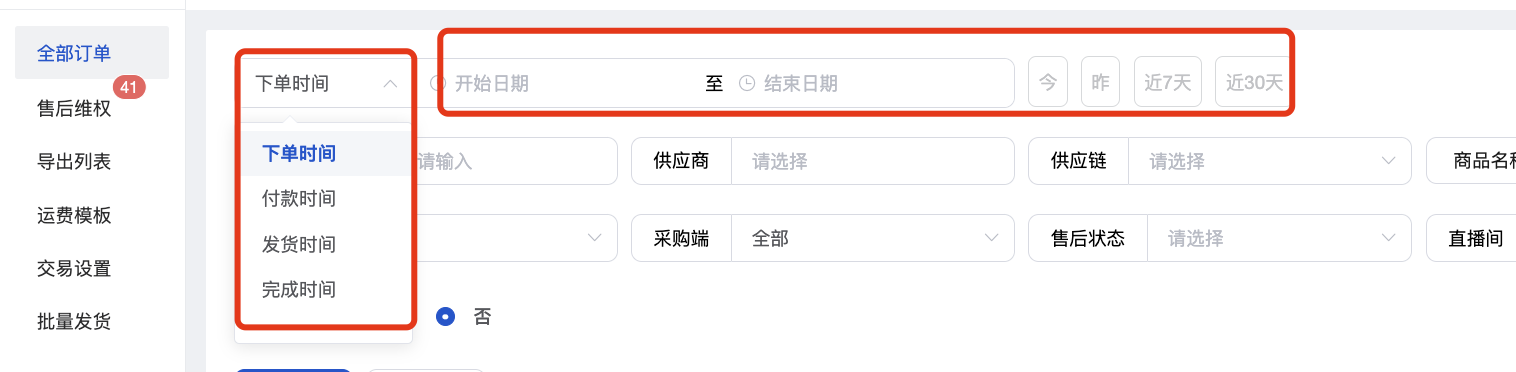 (1)时间类型:可以按下单、付款、发货、完成收货等时间段来搜索对应类型的订单。