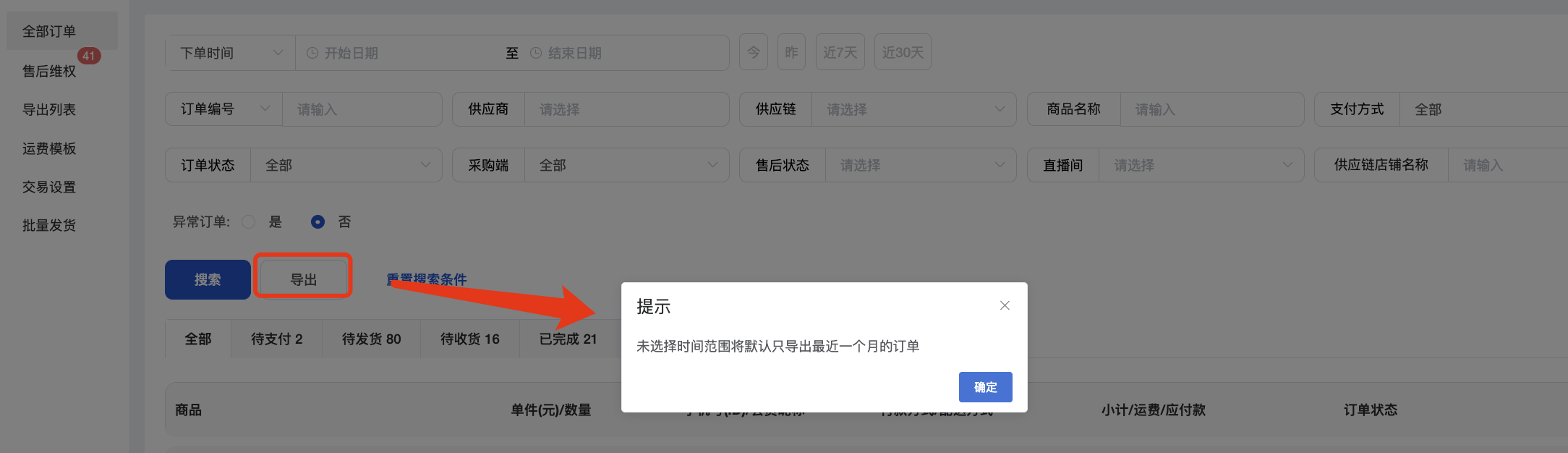 (12)导出。若无筛选条件就点击导出,未选择时间范围将默认只导出最近一个月的订单,如下图所示。