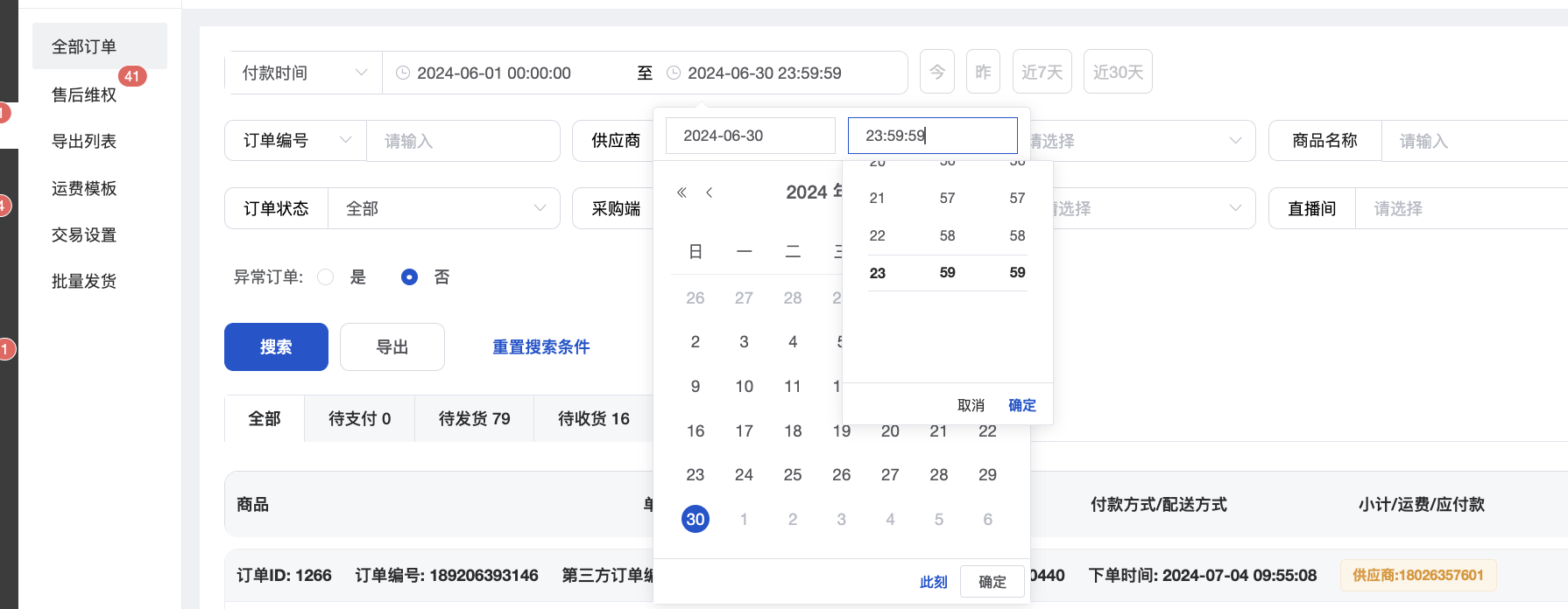比如搜索6月1号0点到30号23点59分这段时间的支付订单,可以选择付款时间,开始日期选6月1号0点,结束日期选6月30号23点59分59秒,如下图所示。