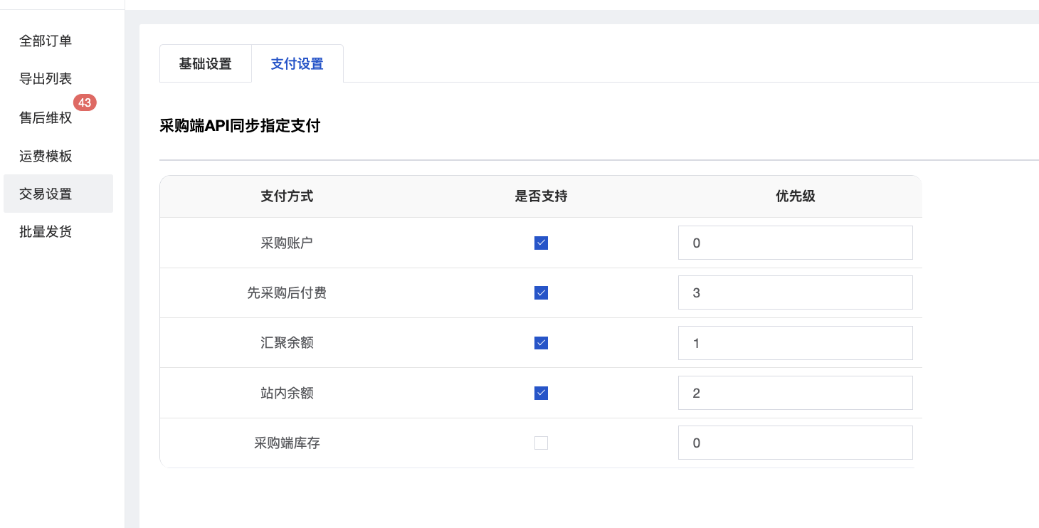 设置采购端API同步指定支付方式,勾选则支持,可设置优先级显示。