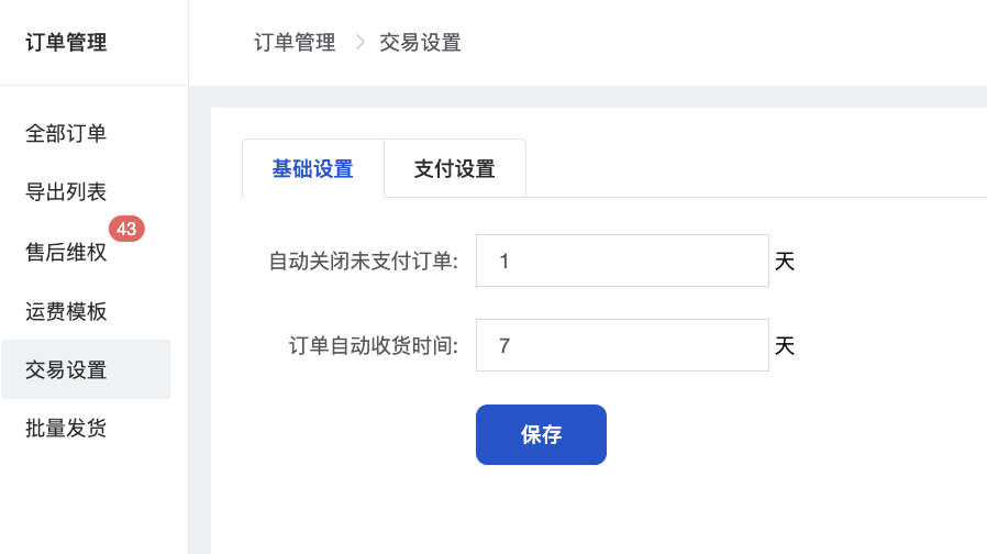 2、订单自动收货时间:订单发货后达到设置的天数就会自动确认收货,完成订单