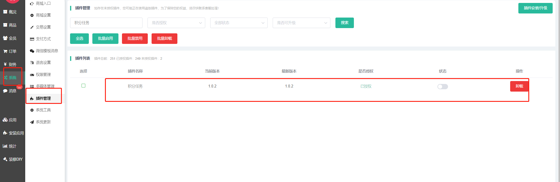 启用路径:总后台 — 系统 — 插件管理 –启用“积分任务”插件