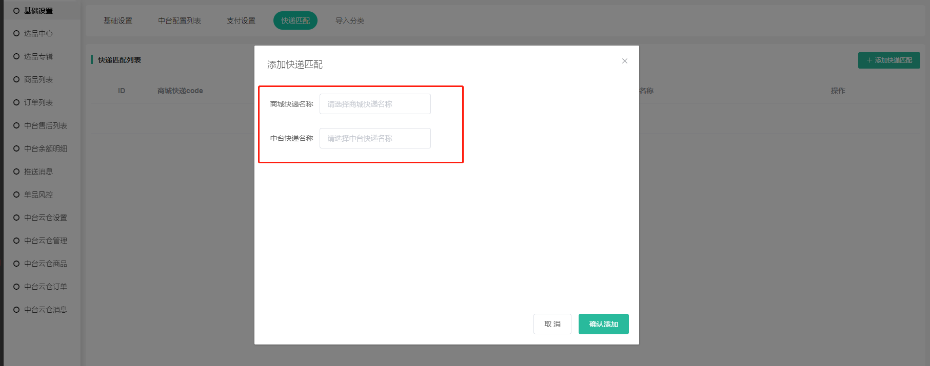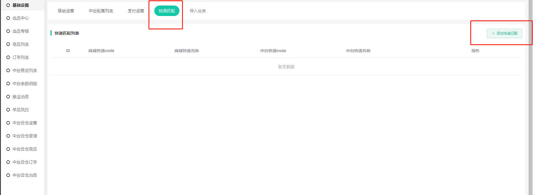 快递匹配作者: aishidai / 2025年11月21日 当中台快递名称和商城的快递名称不一致,导致物流信息查询不到的时候,可以添加快递匹配,匹配中台快递与商城快递的名称; 注意:关联快递匹配之后,没显示物流信息的订单号要重新发货才会有物流踪迹,不会修改关联之前发货的订单物流。