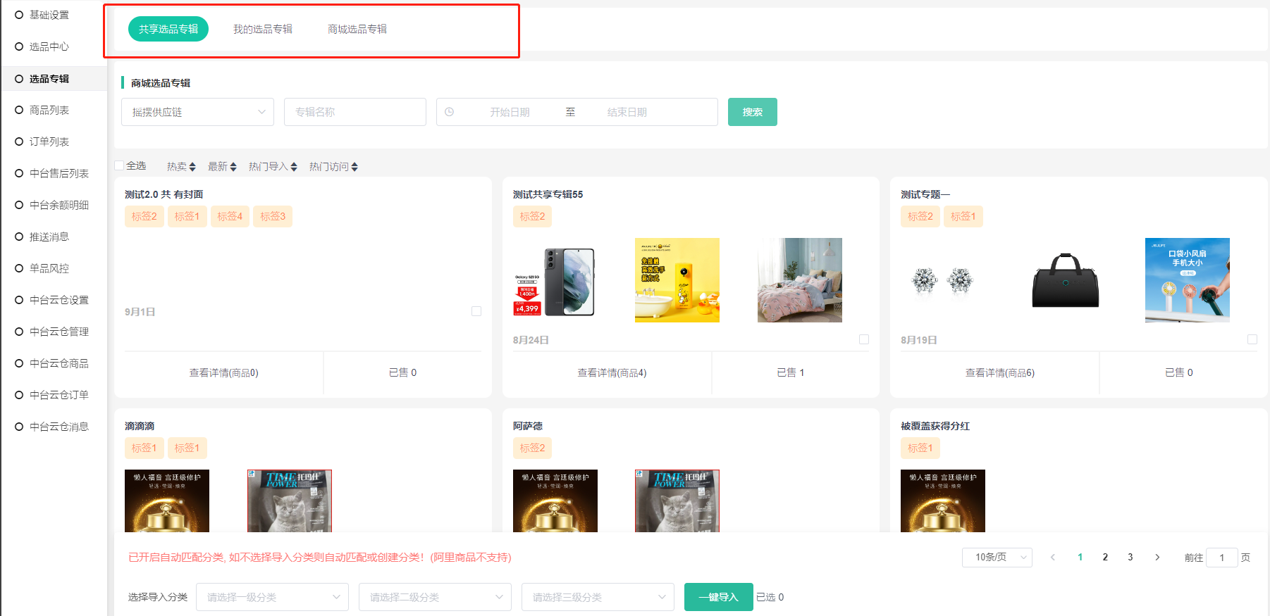 显示平台所有共享的商品专辑;支持一键导入专辑、查看专辑详情;