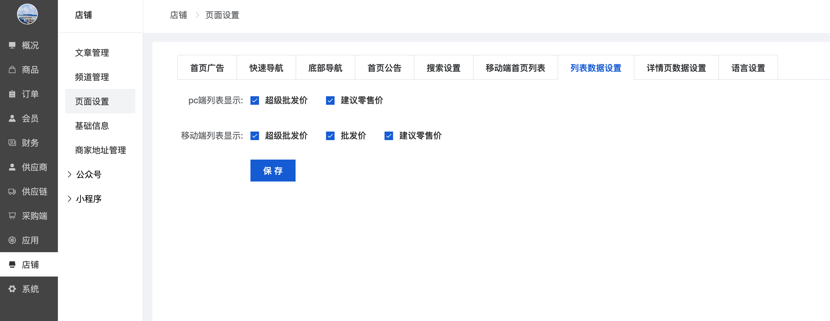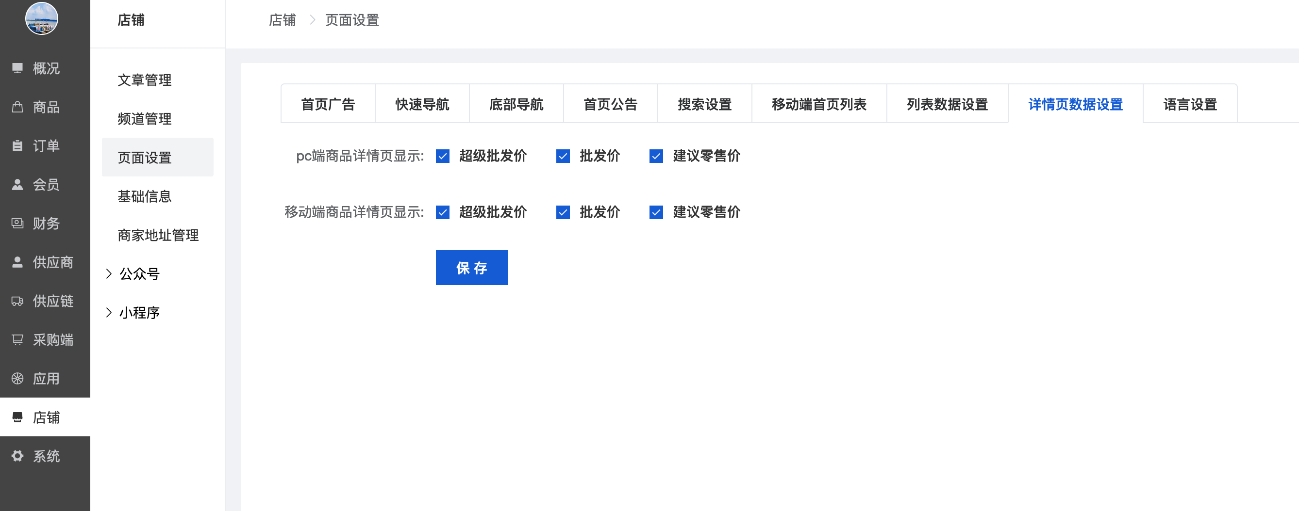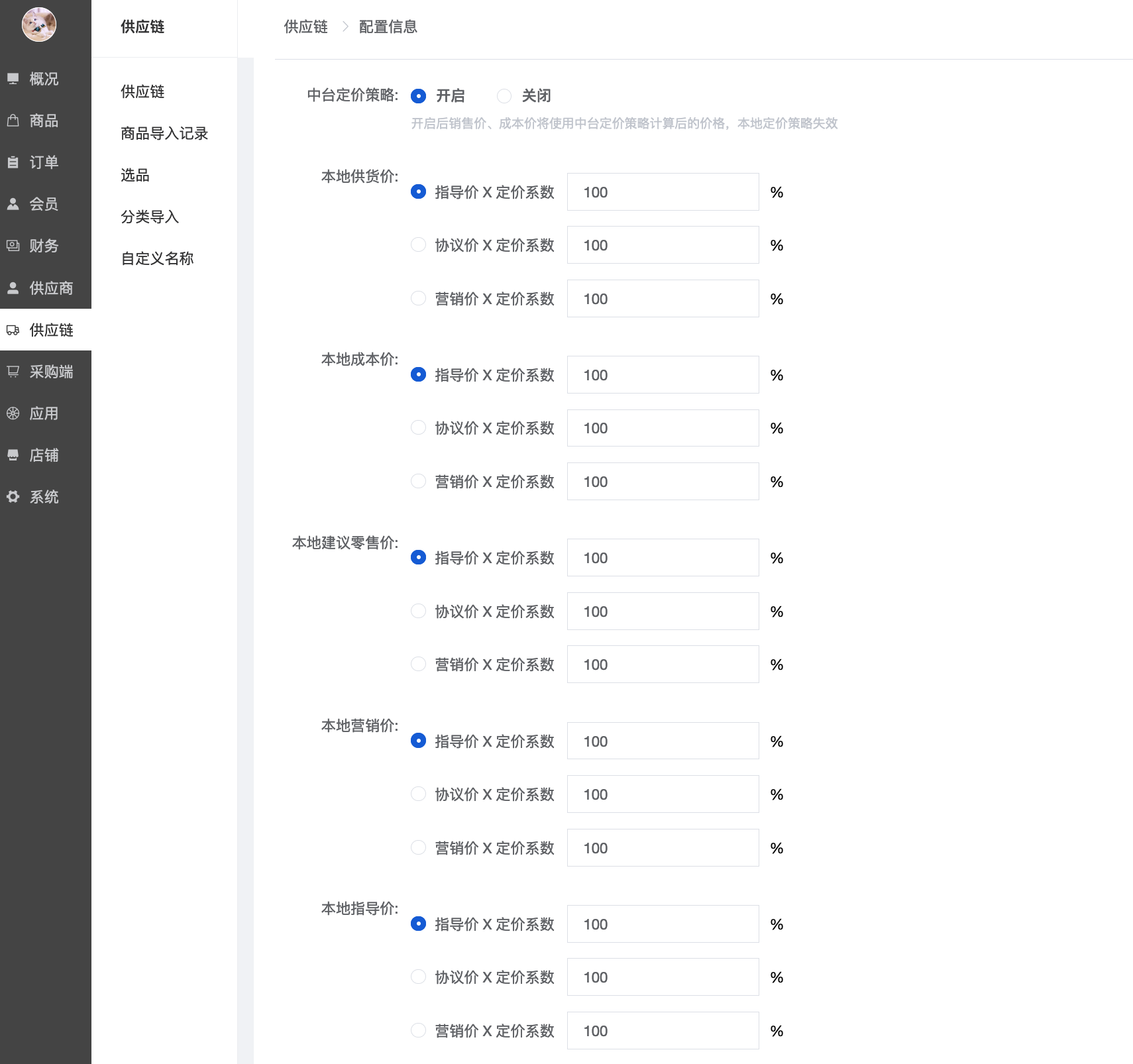 开启:本地的商品价格除成本价外,其他和导入的供应链中台(导入的对象)保持一致;下游导入的时候,本地成本价=中台采购端会员等级供货价*(1+采购技术服务费比例)%