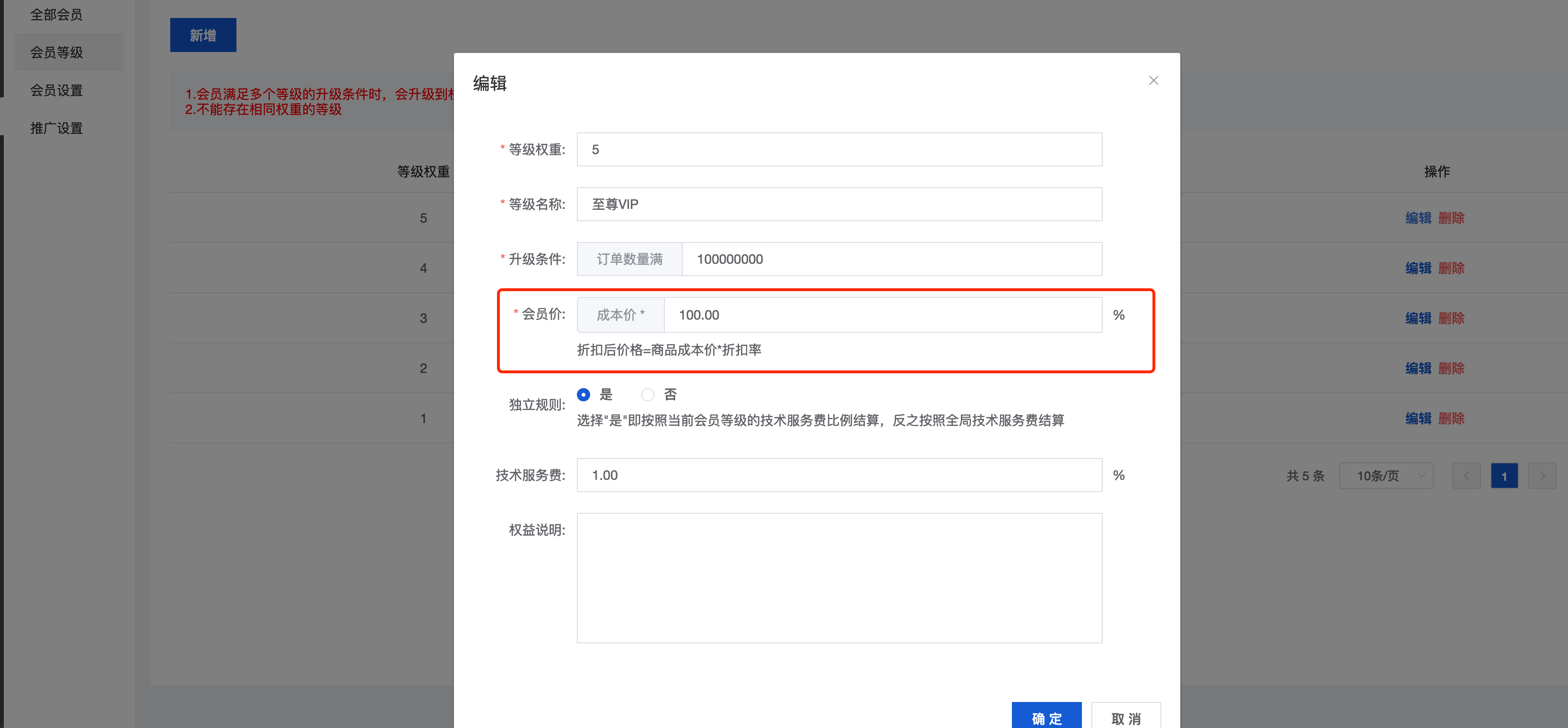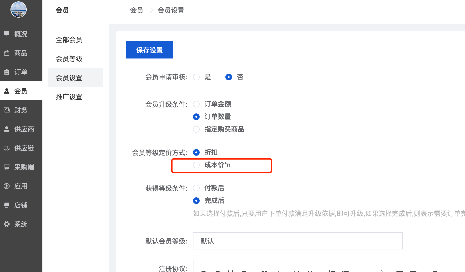 在会员设置中增加会员等级定价方式选择:折扣(默认)、成本价*N%