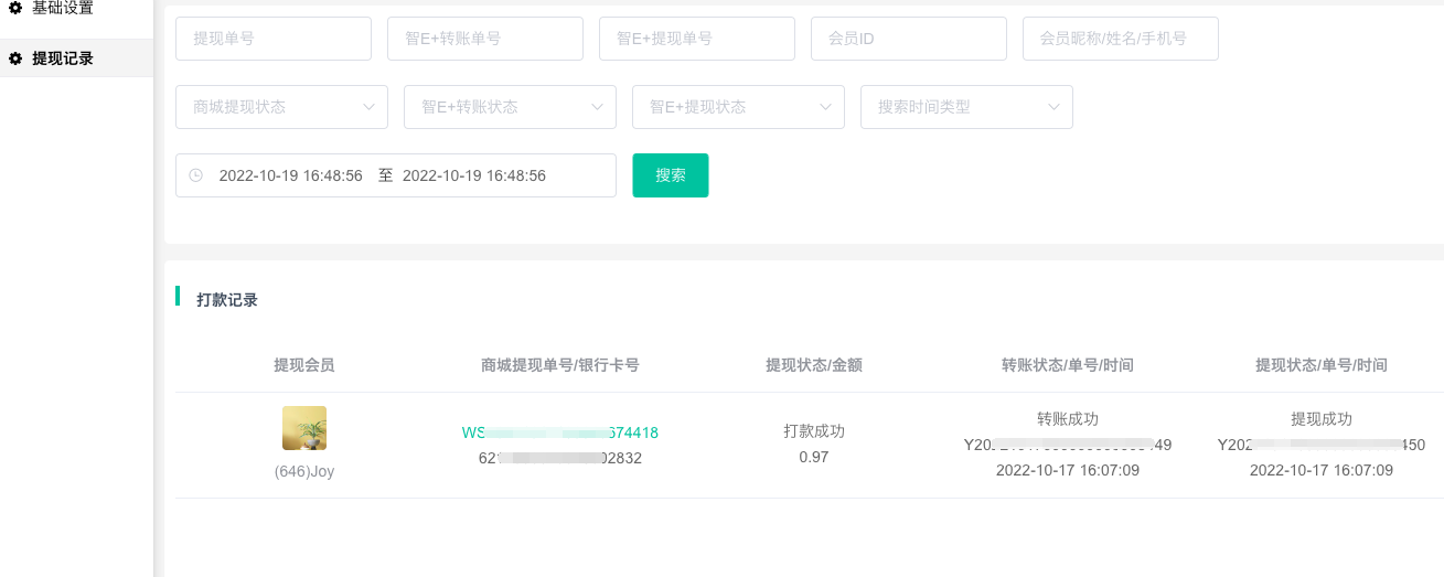 6, 确认后后台提现记录点击审核打款,打款后在智E+插件提现记录可查看到记录