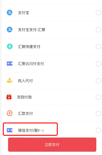 1, 前端商品下单,订单支付页面会显示微信支付(智E+)。仅订单支付