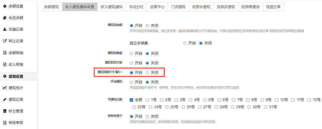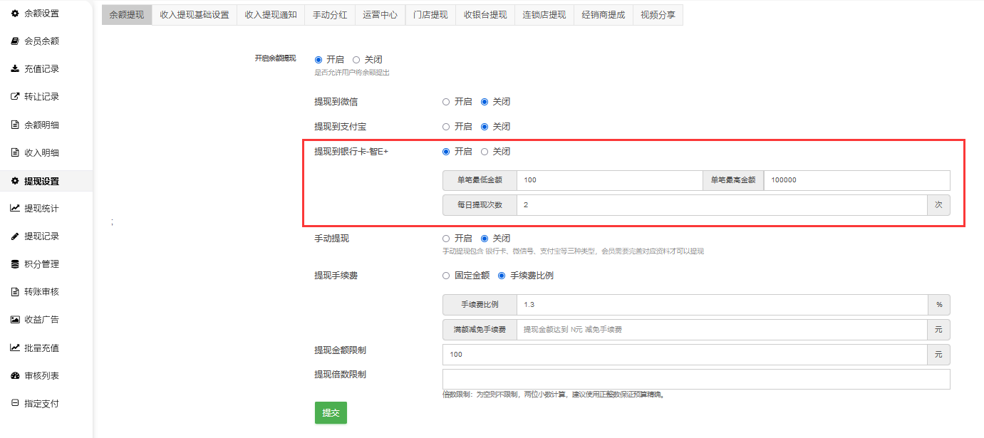 1, 后台财务、余额提现/收入提现设置增加提现到银行卡-智E+