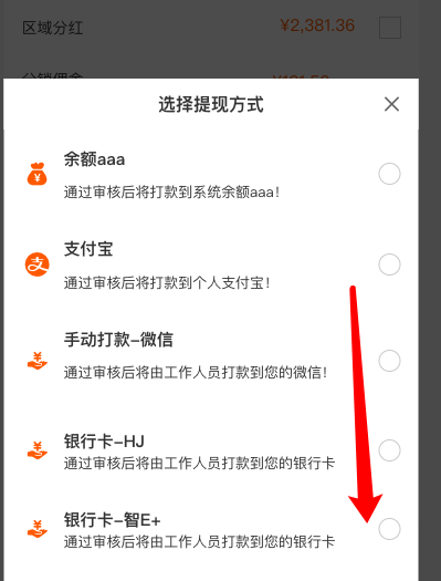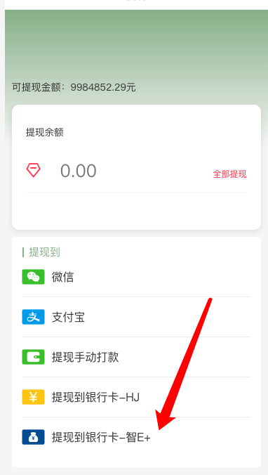 2, 前端收入提现/余额提现页面可选择提现到银行卡-智E+