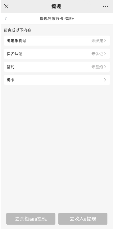 3, 首次提现需要绑定手机号,实名认证,签约,绑卡(绑定手机号和实名认证都与商城的绑定手机号、实名认证无关)