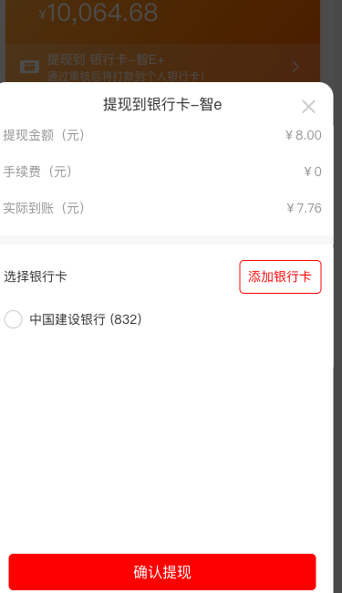 5, 收入/余额提现选择提现到银行卡-智E+,确认后点击提现,然后选择银行卡点击确认提现