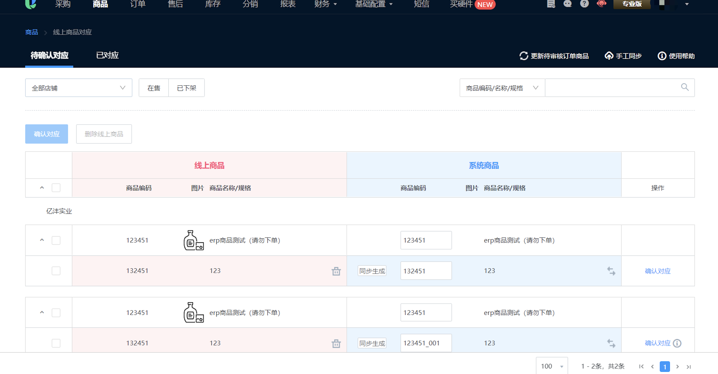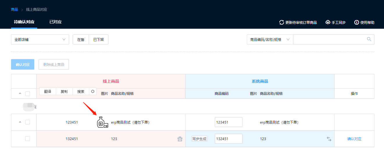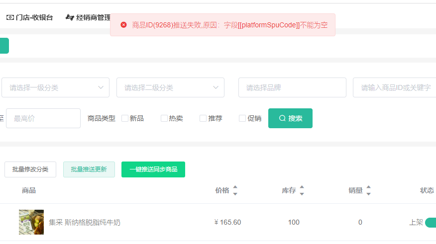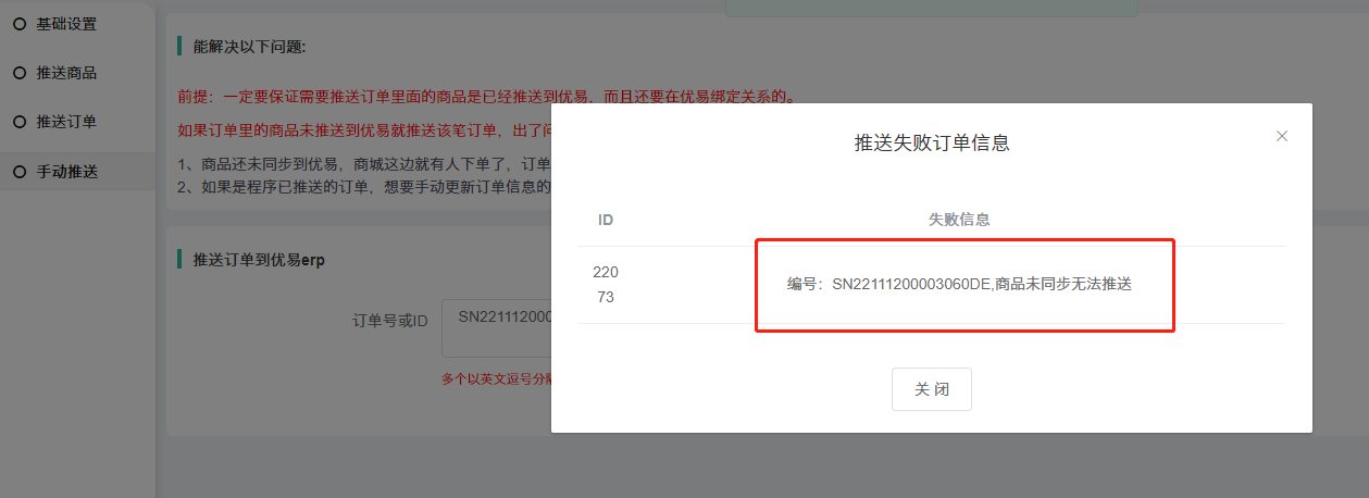 手动推送订单,提示:商品未同步无法推送