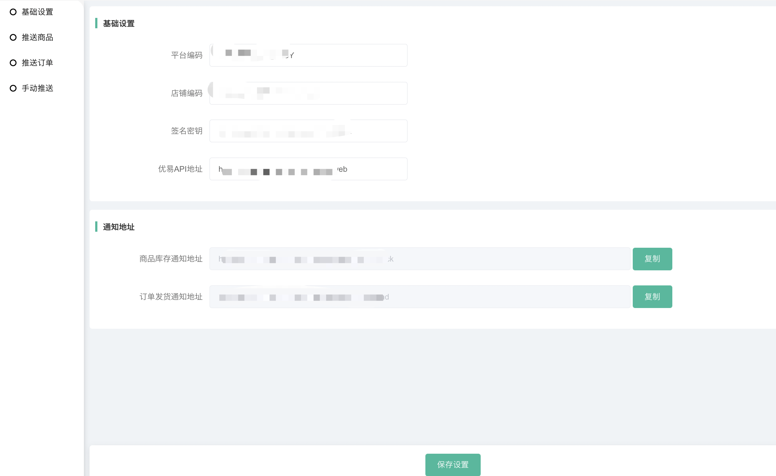 1、平台编码、店铺编码、签名密钥、优易请求地址(每个账户单独请求地址,填写对应请求地址,这方面需联系优易)、商品库存通知地址、订单发货通知地址——需登录(优易官网:http://youyierp.800best.com/)联系优易客服购买接口后获取。注意:填写基础信息时,前后不能有空格,填写完毕后需检查下。