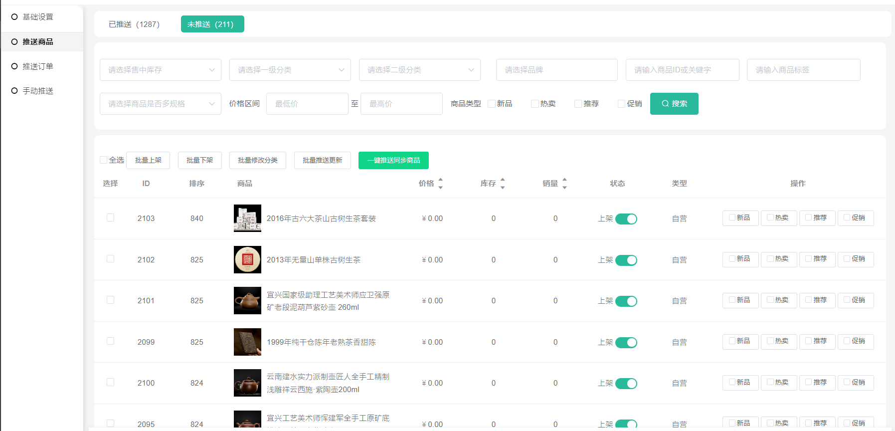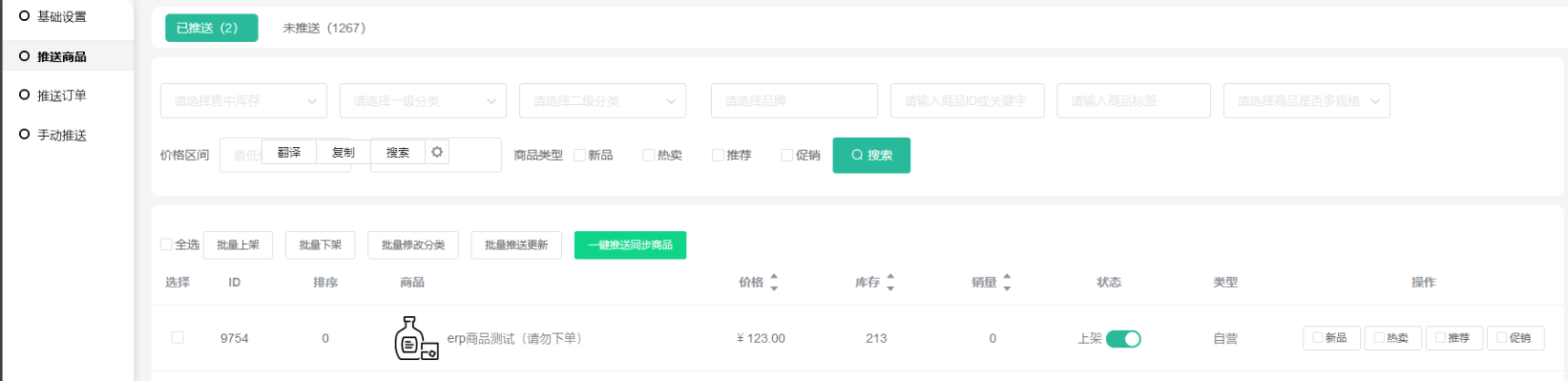 2、一键推送同步商品(把商城自营全部未推送的商品推送到第三方)