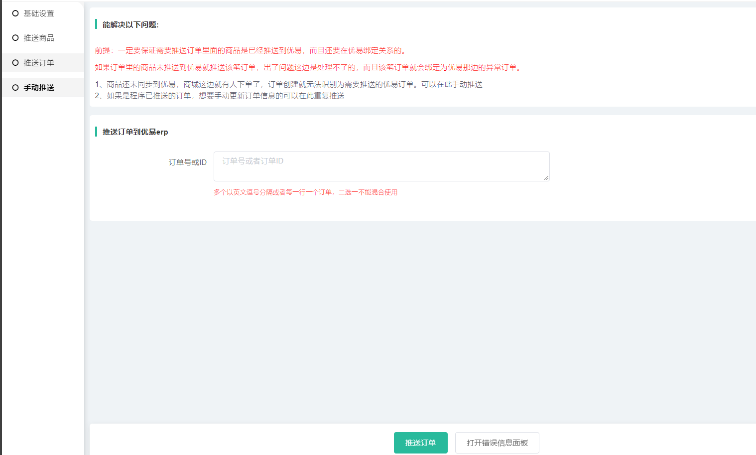 1、商品还未同步到优易,商城这边就有人下单了,导致订单创建就无法识别为需要推送的优易订单。可以在此手动推送